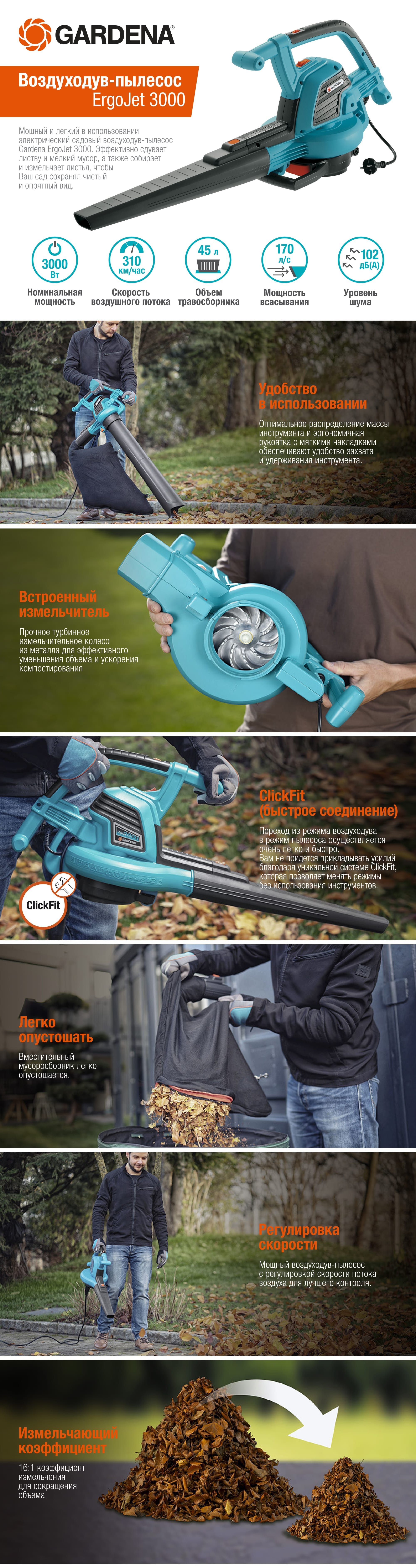 Переход из режима воздуходува в режим пылесоса осуществляется очень легко и быстро. Вам не придется прикладывать усилий благодаря уникальной системе ClickFit, которая позволяет менять режимы без использования инструментов.