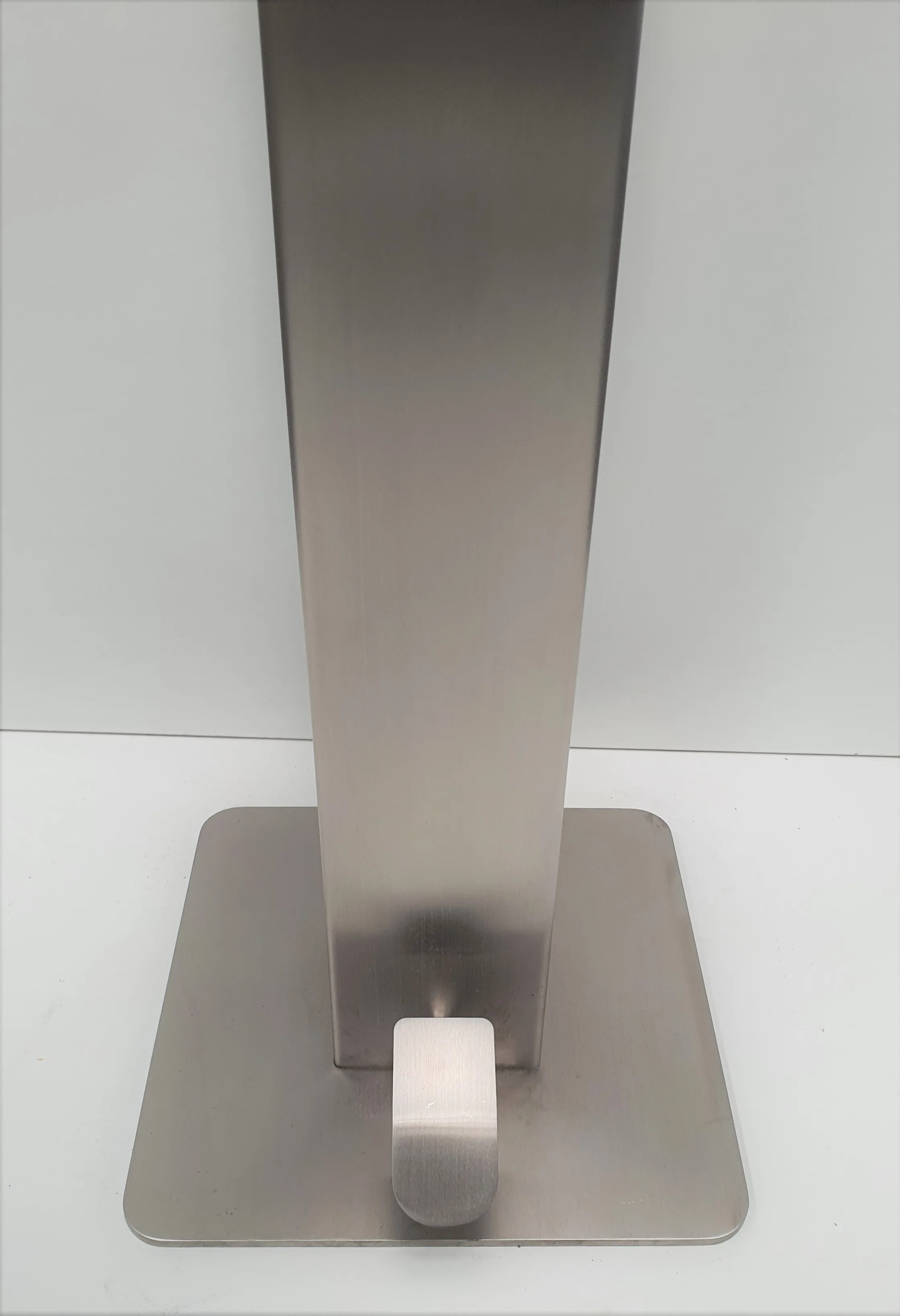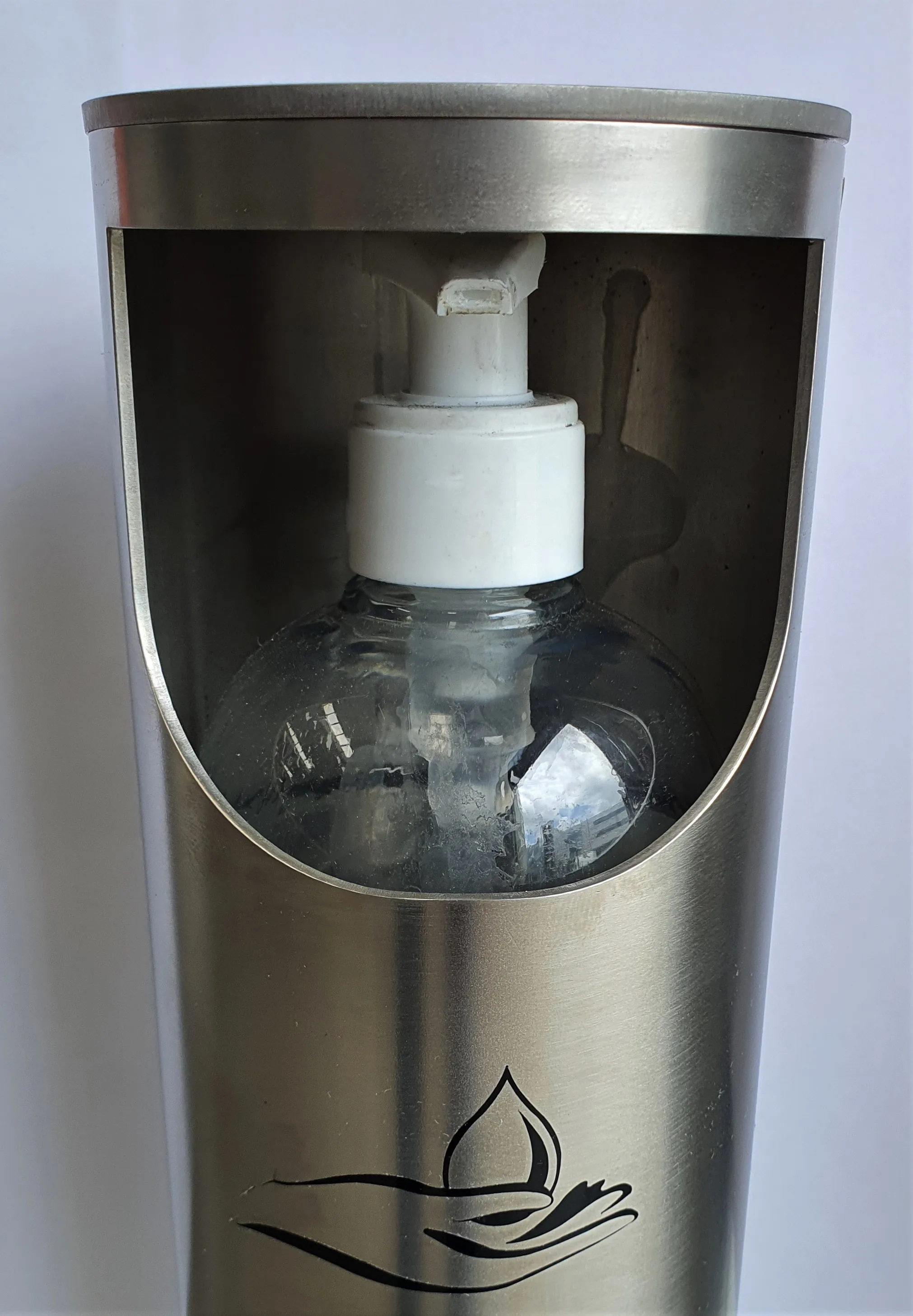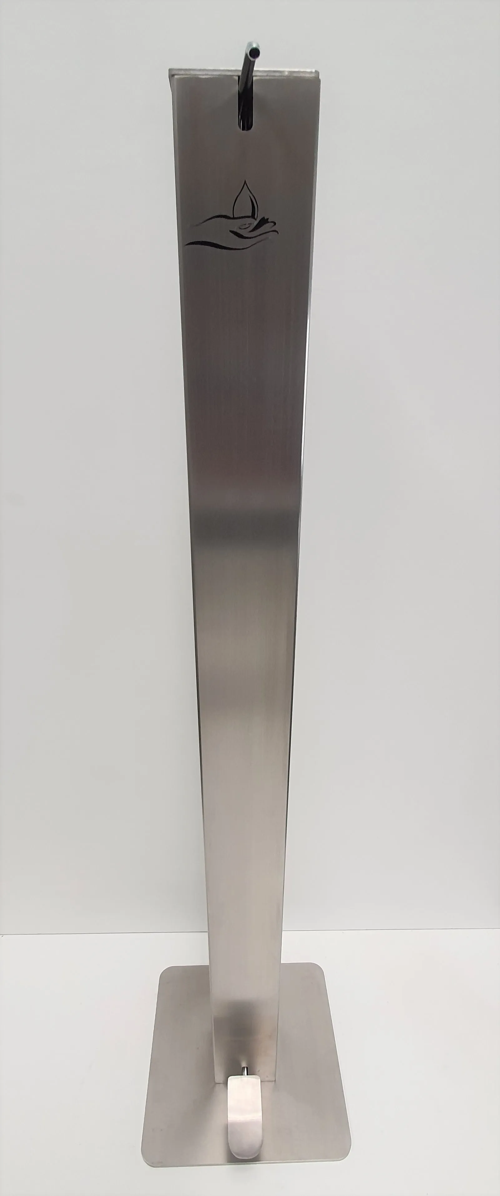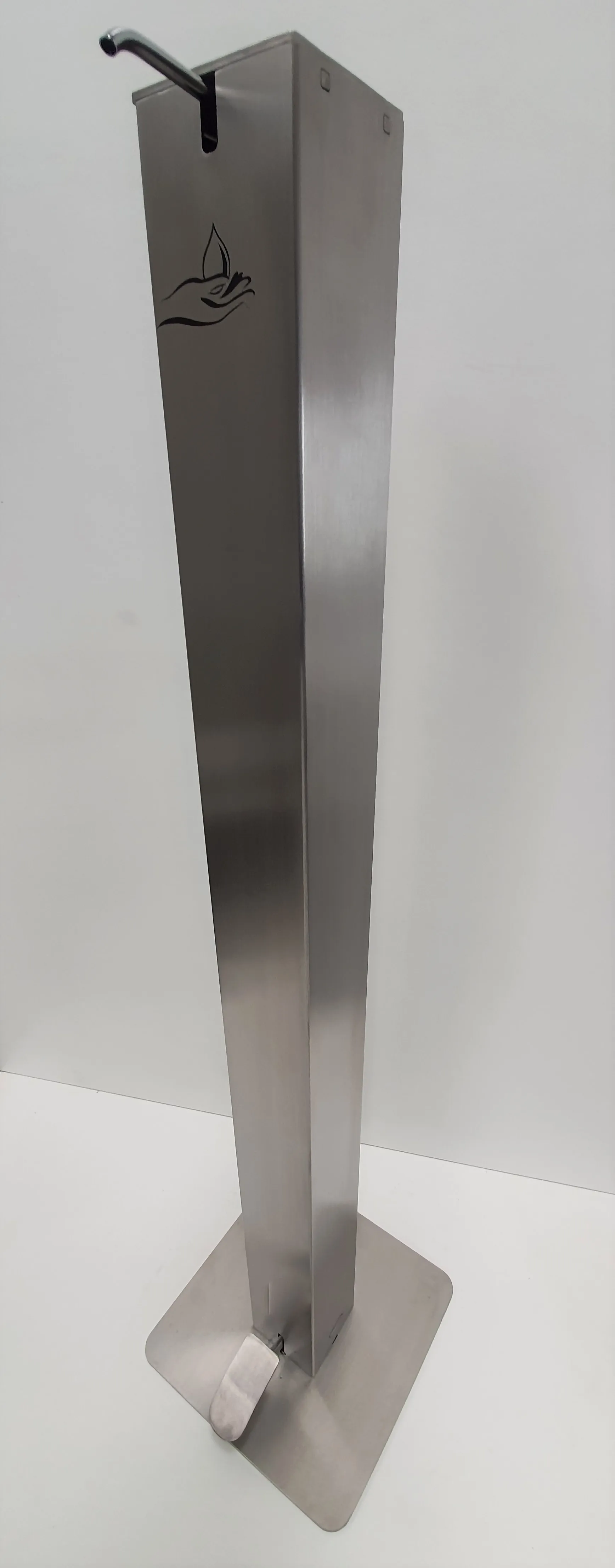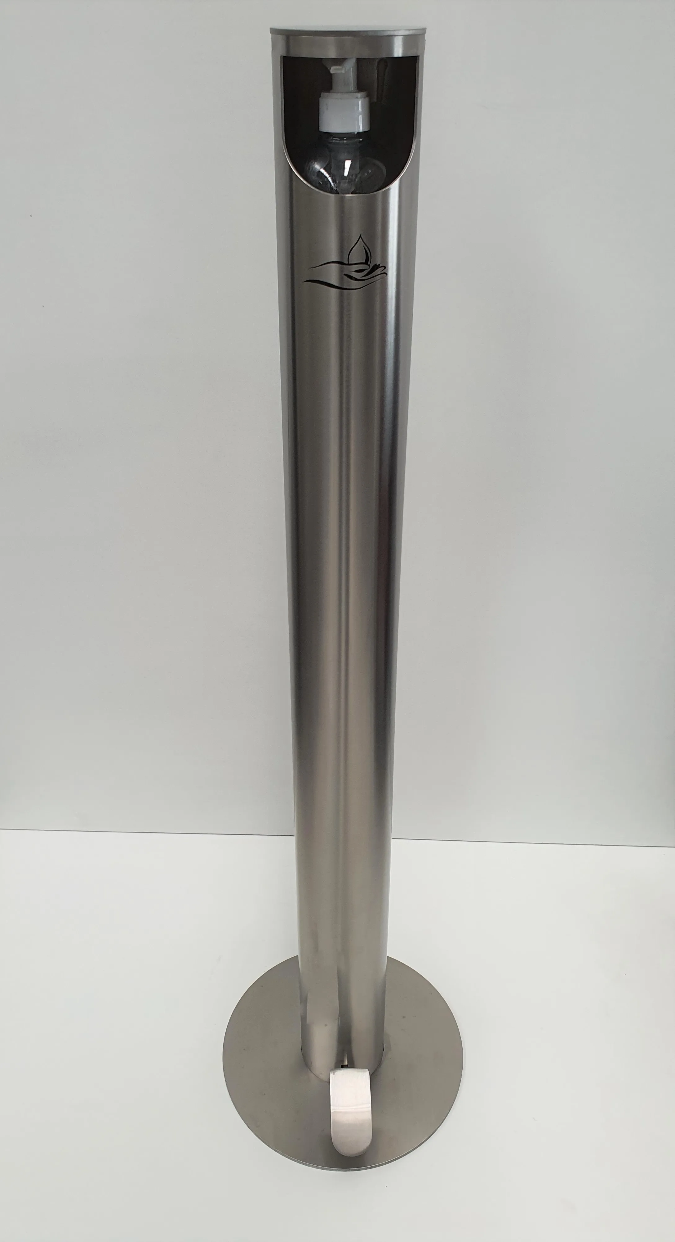 Dispensador en Acero inoxidible, cerrado. Incluye depósito recargable. Accionamiento mediante педаль. Основание 250x250 мм Altura 1000 мм. Boquilla dispensadora en acero inoxidible.