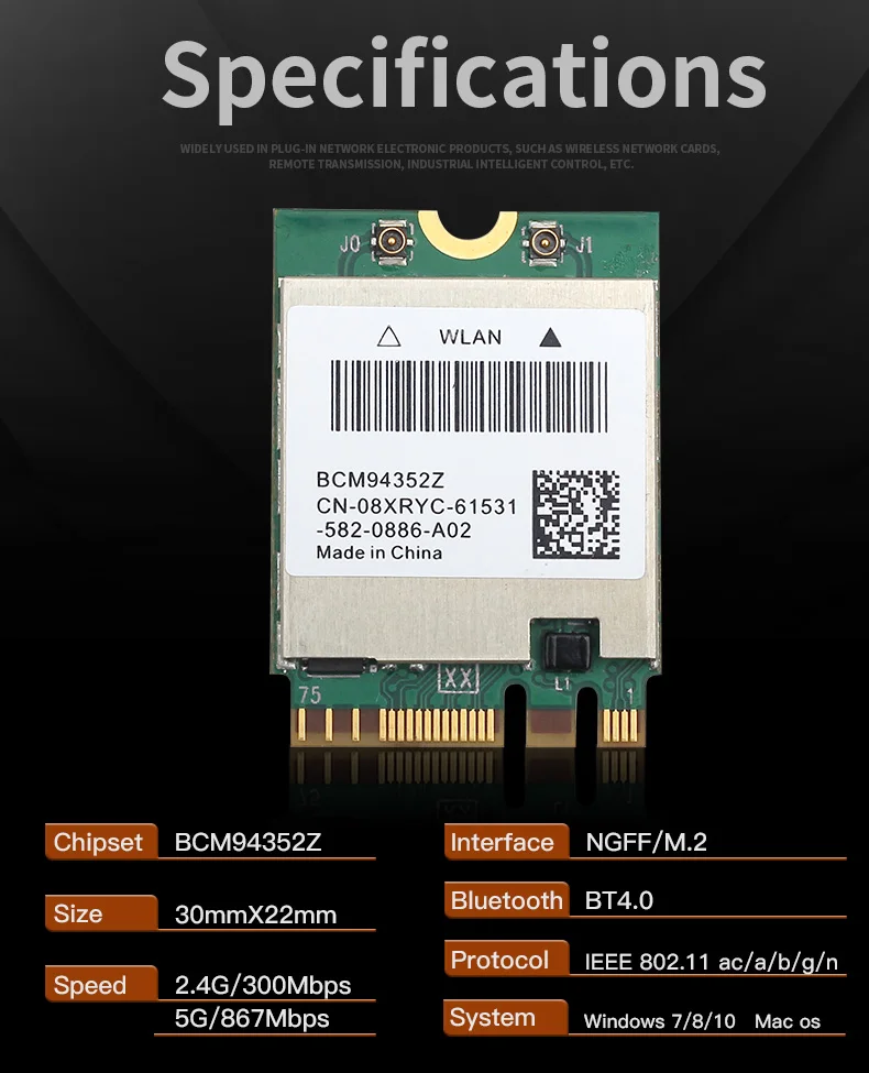 Описание: Модель: BCM94352/DW1560; Интерфейс: NGFF; Класс устройства: 802,11 ac/a/b/g/n; Скорость до 867 Мбит/с (5 ГГц), 300 Мбит/с (2,4 ГГц); Двухдиапазонный: 2,4 ГГц/5 ГГц; Bluetooth: BT 4,0; Система поддержки: Windows 7/8/8.1/10 и macOS, Hackintosh. Поддержка Handoff и airdrop; Размер: 22*30 мм.