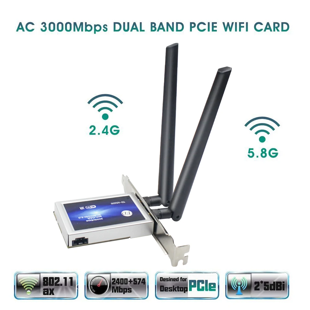 Модель: AX3000 PCI-E PC wifi адаптер (см. Подробности); Chipest: чипсет Intel AX200; Новый Wi-Fi с Blutetooth 5,0; Стандарт IEEE: 802.11ax/ac/a/b/g/n; Двухдиапазонный 2,4 ГГц-300 Мбит/с/5Ghz-2400Mbps; Примечание: скорость до 2400 Мбит/с (маршрутизатор должен поддерживать 802.11ax); Поддержка MU-MIMO; Операционные системы: Поддержка только Windows 10*64 бит и Linux; Совместимость с: почти компьютером с PCI Express (разъем PCI-E 1X/4X/16X); Специально разработанный радиатор обеспечивает стабильную и надежную непрерывную работу; Антенны с высоким коэффициентом усиления 6DBi обеспечивают лучший прием сигнала.