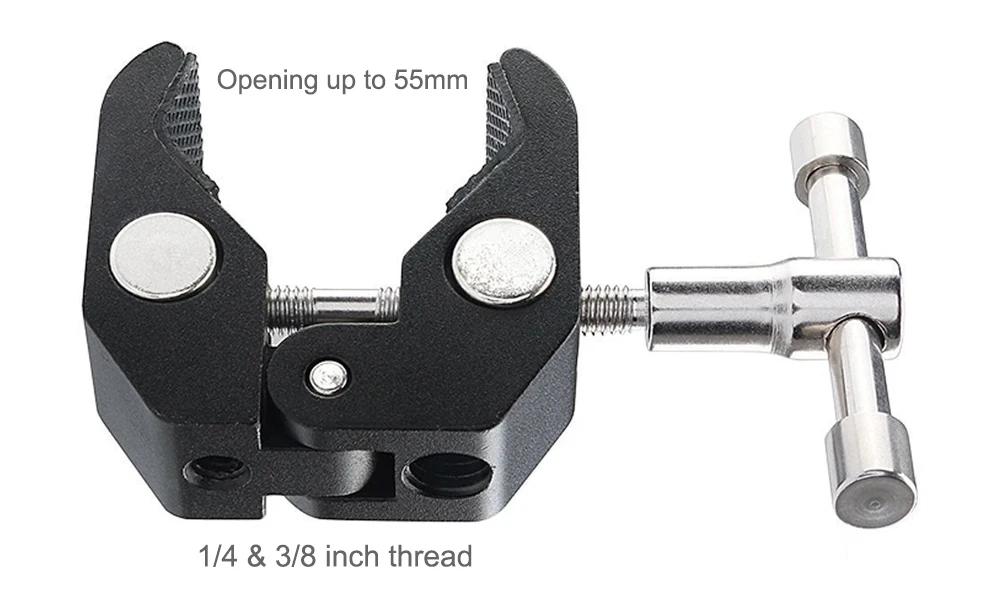 SUPER CLAMP-magic arm clamp имеет гнездо 1/4-20 и 3/8-16, оба стандартных размера фитинга в фотостудии для головок и штативов используется для различных насадок. Как камеры, 15 мм стержни, светодиодные фонари, зонты, крючки, полки, Пластины стекла, поперечные стержни и т. Д.
