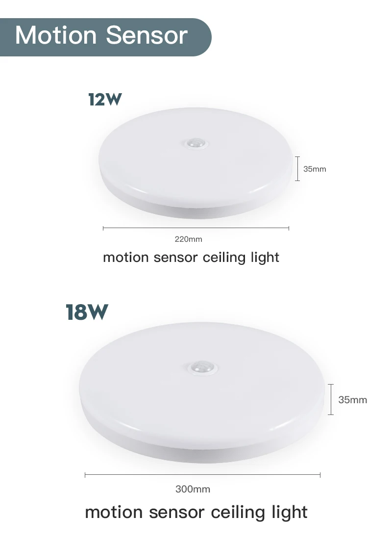 Поверхностного монтажа светодиодный Потолочные светильники движения PIR Сенсор ночного освещения 12/18 Вт современные потолочные светильники для вход балкон коридор Напряжение: AC180-265V Светодиодный чип: SMD2835 Материал: PC + ABS Цветовая температура: 6500K, Ультратонкое естественное освещение CRI: около 80 Эффективность освещения: около 95 Гарантия: 1 год Диапазон датчика: 3-5 м (тип датчика движения) Время задержки: 30-60 с (тип датчика движения)