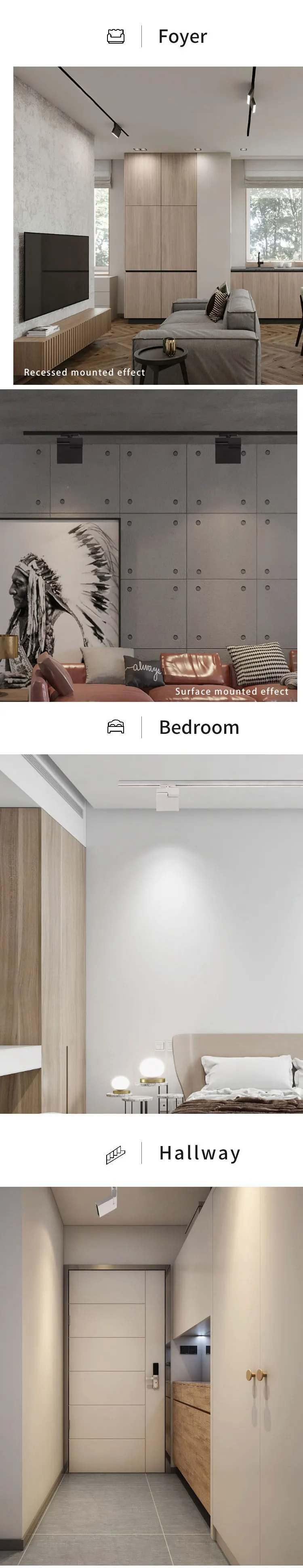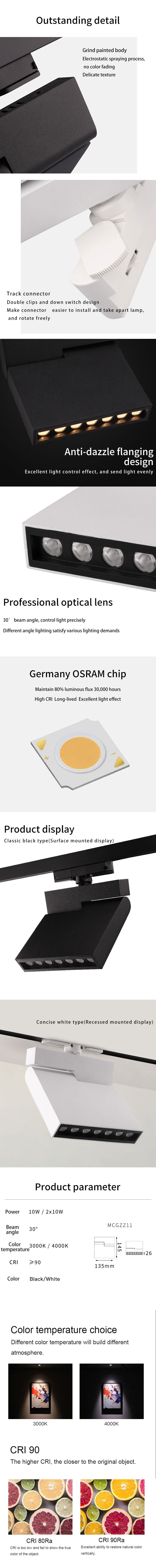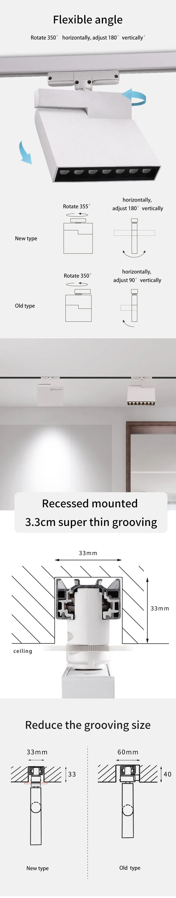 Скрытый источник света, высокий CRI Безопасная и простая установка Измельчить алюминиевый корпус, Германия OSRAM чип, оптический объектив Down переключатель дизайн, Двойные клипы, Симметричная голова трек Гибкий угол Поверните на 350 градусов по горизонтали, отрегулируйте на 180 градусов по вертикали