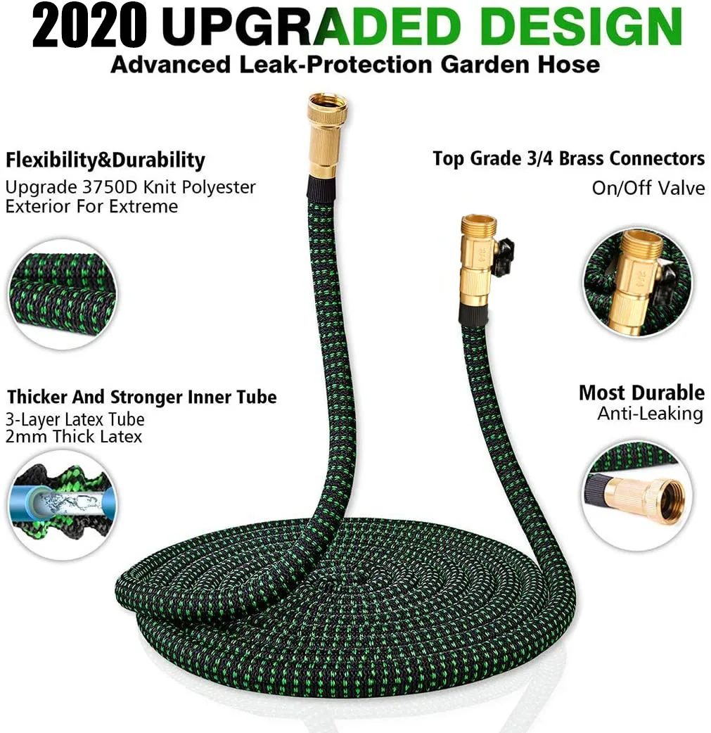 Ультра расширяемый и легкий: когда давление воды включено, садовый шланг может растягиваться до 3 раз от его первоначальной длины; При выключении, он может автоматически договориться; таким образом, он никогда не будет вращаться под углом или кататься; Делает его легким для воды и хранения Герметичная и Ударопрочная конструкция: Улучшенная толстая и Бесшовная Трикотажная конструкция, изготовленная из сверхгибкой и прочной полиэфирной ткани 3750D, обеспечивает лучшую защиту для внутренней трубки, таким образом, он может выдерживать высокое давление воды (до 15 бар/1,5 МПа); Больше не всплесков, трещин, протечек или коррозии, Пришло время попрощаться с вашим старым стилем утечки шланга! Превосходный материал и удивительная Долговечность: разработан с герметичным твердым латунным соединителем 3/4 дюйма, расширяемый шланг является супер утечкой и устойчивостью к ржавчине. Его двойная латексная трубка делает ее настолько прочной, что она может подойти к температурному диапазону 41 ℉-113 ℉. Так что наш шланг для долгосрочного использования 8 функция распыления сопла: поставляется с 8-образной насадкой-распылителем, наш садовый расширяющийся шланг обеспечивает умные решения для удовлетворения всех ваших потребностей в поливе и очистке и использовании очистки: сад, Дворы, полы, лужайки, домашние животные, бассейн, автомойка и т. д. Кроме того, шланг для воды хорошего качества может служить идеальным подарком для всех садовников