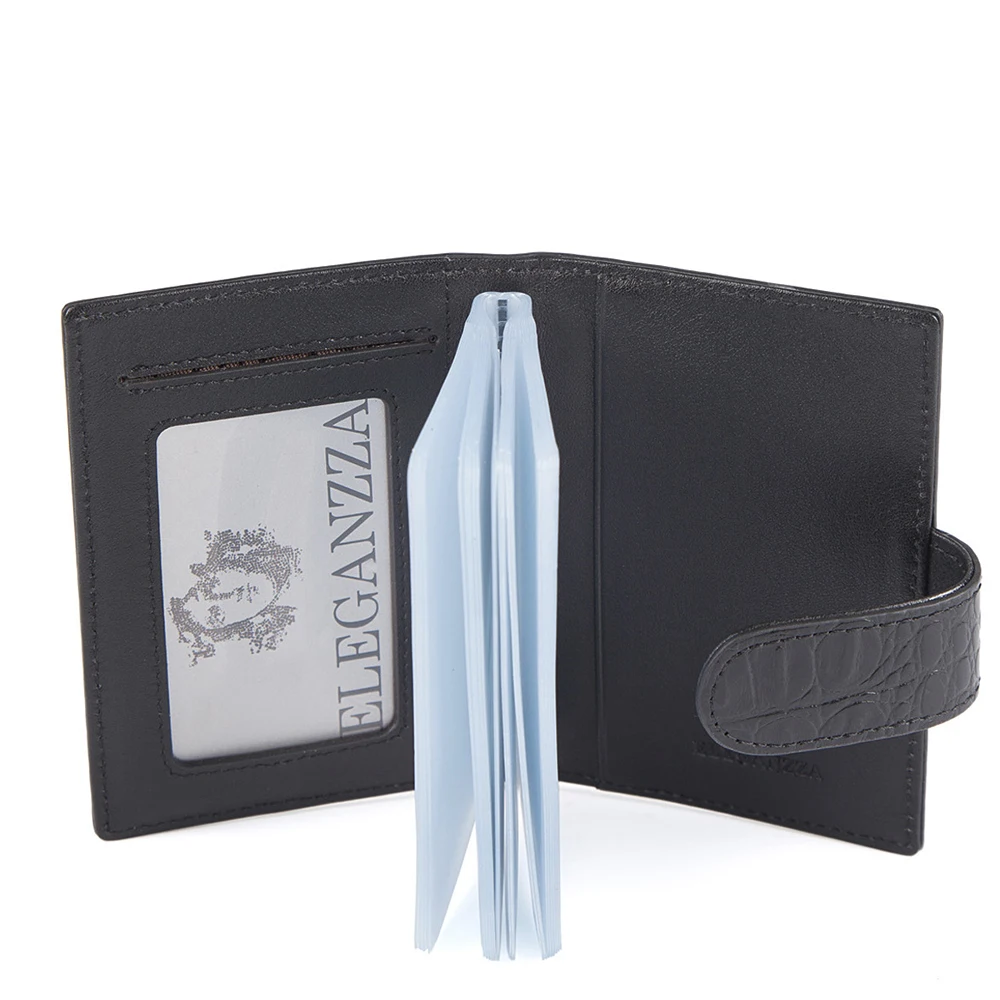 Визитница торговой марки ELEGANZZA из натуральной кожи. Модель вмещает 21 визитку. Закрывается на клапан с кнопкой.