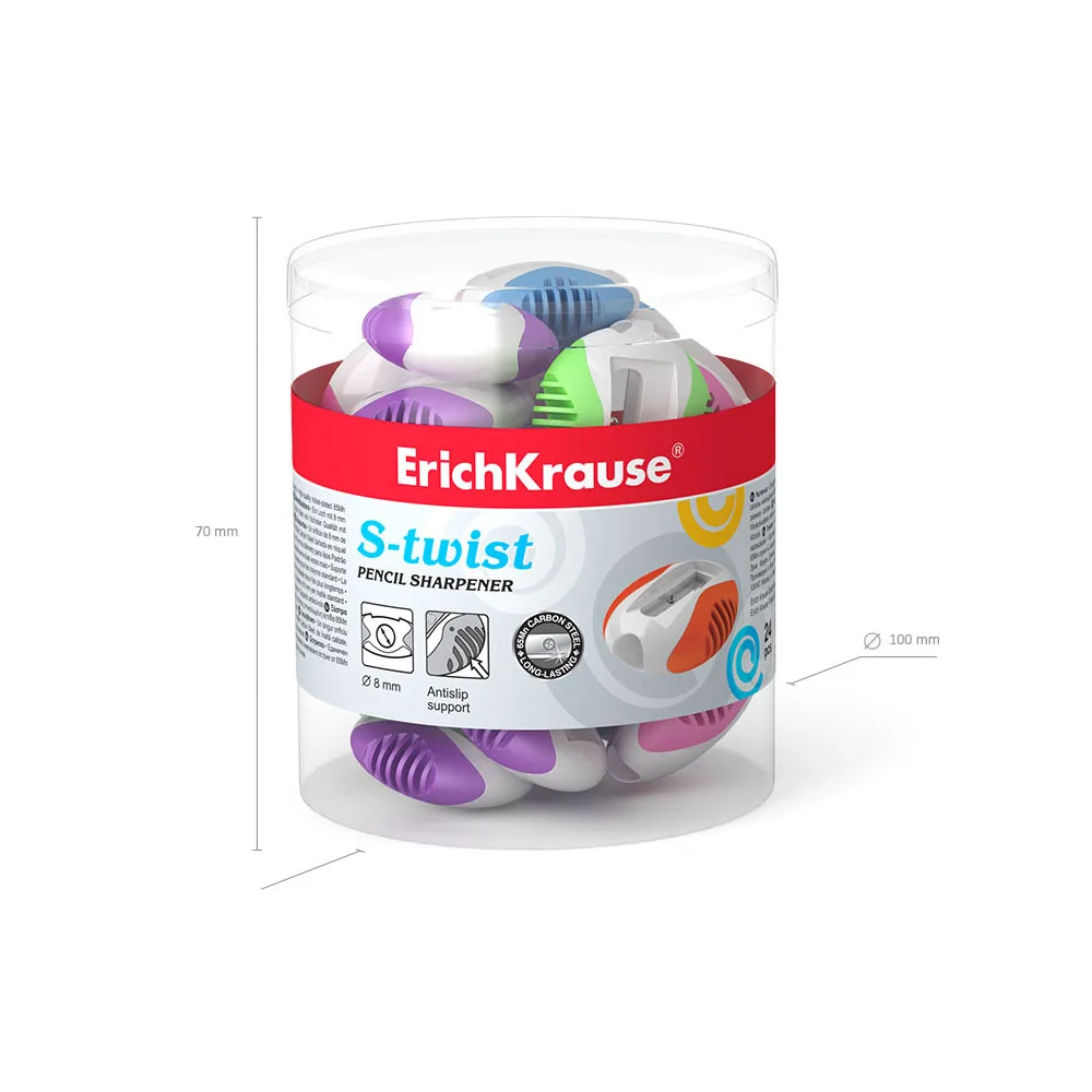 Пластиковая точилка с цветными, противоскользящими резиновыми вставками. Имеет отверстие диаметром 8 мм для заточки стандартных чернографитных и цветных карандашей. Высококачественное никелированное брендированное лезвие из углеродистой стали гарантирует высокую производительность.