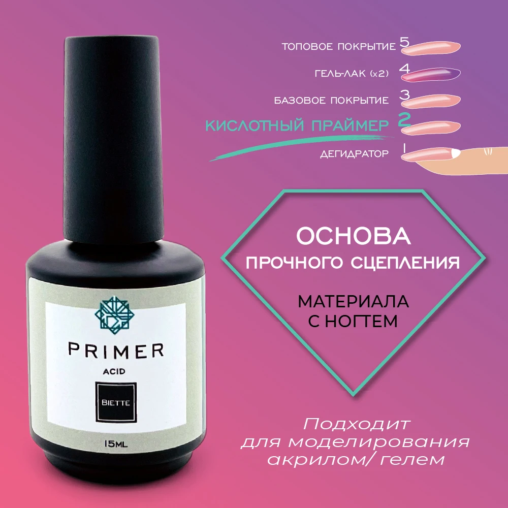 BIETTE Кислотный праймер для ногтей Acid Primer, 15 мл / Стойкое покрытие без отслоек и сколов