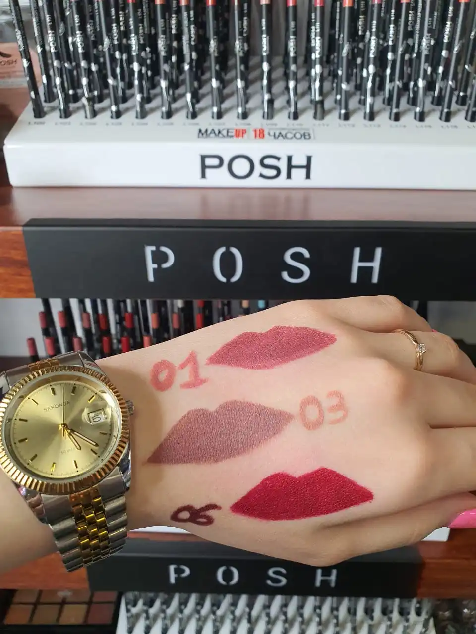 POSH 01 Натуральные губы Кремовая жидкая помада VELVET MATTE с Аргонометрическим аппликатором МАТОВЫЙ ФИНИШ ЭФФЕКТ ВЕЛЬВЕТОВЫЕ ГУБЫ СУПЕРСТОЙКОСТЬ 18 часов Универсальный оттенок подчёркивает естественный пигмент губ, добавляя насыщенность и яркость. Губы выглядят ухоженными и соблазнительными. ANTI-AGE-ЭФФЕКТ в дуэте с ЖЕЛЕЗОБЕТОННЫМИ карандашами POSH L 100, L01. Нежнейшая Кремовая текстура покрывает губы невесомой вельветовой вуалью. В процессе нанесения оттенок проявляет насыщенность, становится матовым и ЖЕЛЕЗОБЕТОННО застывает на 18 часов БЕЗ ОЩУЩЕНИЯ ЛИПКОСТИ и СТЯНУТОСТИ. Формула с натуральными компонентами увлажняет, смягчает и разглаживает нежную кожу губ. Аргонометрический аппликатор с выемкой комфортно «облегает» губы, создает чёткий контур и распределяет помаду по всем губам, придавая им сексуальность. Нелипкая текстура с эффектом Бархата! Это то, что вы так долго ждали!!! Способ применения: За 20 минут до нанесения увлажните бальзамом POSH SOS РЕАНИМАЦИЯ ДЛЯ ГУБ. Чтобы повысить стойкость покрытия и скорректировать форму губ, рекомендуем наносить ЖЕЛЕЗОБЕТОННУЮ ПОМАДУ в КАРАНДАШЕ POSH как подложку и контур.