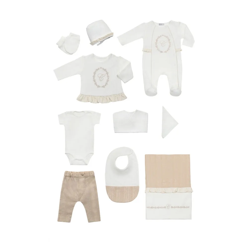 5-6.Комплект из кофточки (застегивается на кнопочки) и штанишек на мягкой поясной резинке с манжетами 7.Фартучек-слюнявчик с кармашком.
