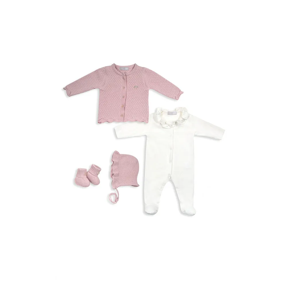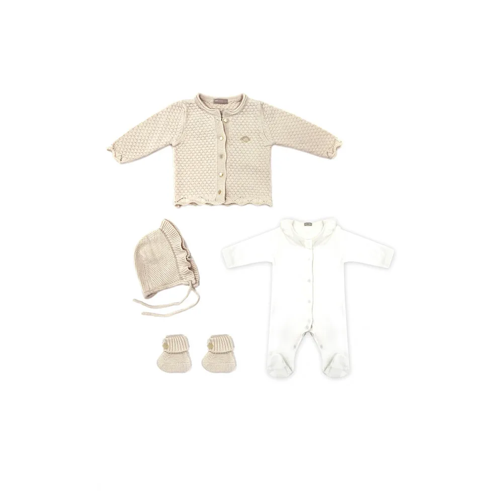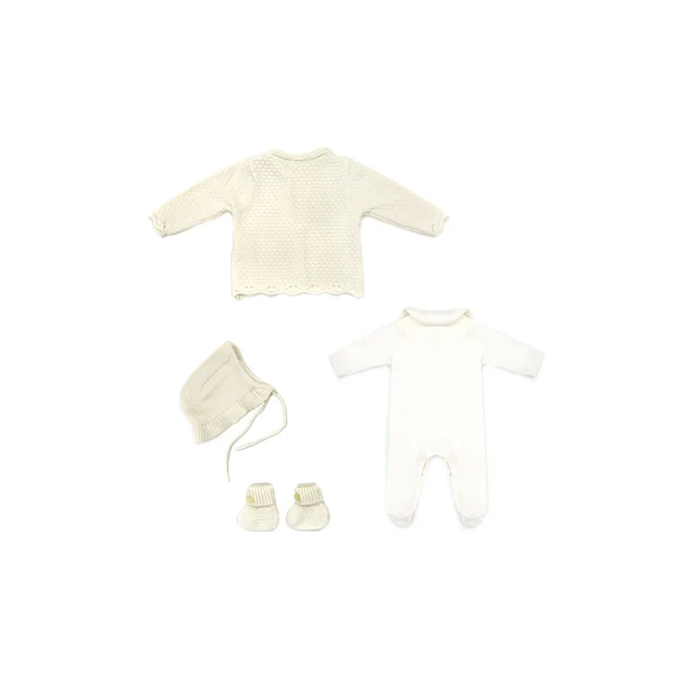 Изысканный вязанный набор для девочек в подарочной упаковке. Состоит из кофточки, комбинезона, пинеток и шапочки.
