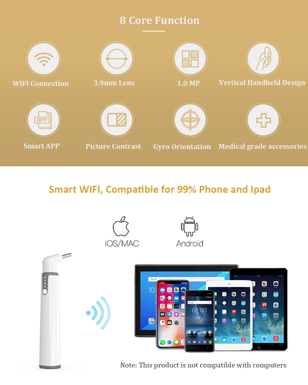 Спецификация: 【Безопасно и Smaller】 3,9 мм Диаметр ультра-тонкий отоскоп с удаления ушной серы инструмент, 6 светодиодный свет и несколько стеклянные линзы с покрытием, который дает четкое под разными углами наклона и очистите ушному каналу. Это хорошо для взрослых и детей, чтобы удалить ушной воск полностью и безопасно. 【 Многократное применение 5 в 1 подходит для проверки и очистки, осмотра ушей, носа, рта, горла и домашних животных. Удобно для семьи, взрослых и детей и домашних животных. Также поддерживает проверку в режиме реального времени, фотосъемку и видео, используя режим сравнения изображений. 【Простое управление и безопасная температура 】 управление одной кнопкой, 6 светодиодный ламп и смарт-чип без нагрева делают выступления на лучшем уровне. Не беспокойтесь о том, что ухо перегревается или слишком холодно. 【Последняя технология Wi-Fi подключение: беспроводное и умное подключение по Wi-Fi, упрощает процесс использования. Широкая совместимость с системой android и ios, смартфоном и планшетом. Поддержка USB порта зарядки. 【Прочный, отличный функциональный упаковы】 высокое качество, длительный срок службы otoscope поставляется с инструкцией, разного размера амбушюры, защитные рукава адаптера и зарядный кабель. Если у вас есть какие-либо проблемы с товаром, пожалуйста, свяжитесь с нами в любое время. Спецификация: Сетевой стандарт: IEE 802,11 b/g/n Антенна: встроенная антенна IPEX Рабочая частота: 2,4 ГГц Скорость передачи данных: 802,11 b/g/n: до 150 Мбит/с Датчик изображения: CMOS Разрешение: 1280x720 Камера Диаметр: 3,9 мм Фокусное расстояние: 10-30 мм Камера светильник источник света: 6 Регулируемых светодиодов высокой интенсивности IP код: IP67 Сертификаты: CE FCC RoHS Посылка: 1x otoscope 3х спектральный 6x Ушная ложка 1x USB кабель 1x Руководство пользователя