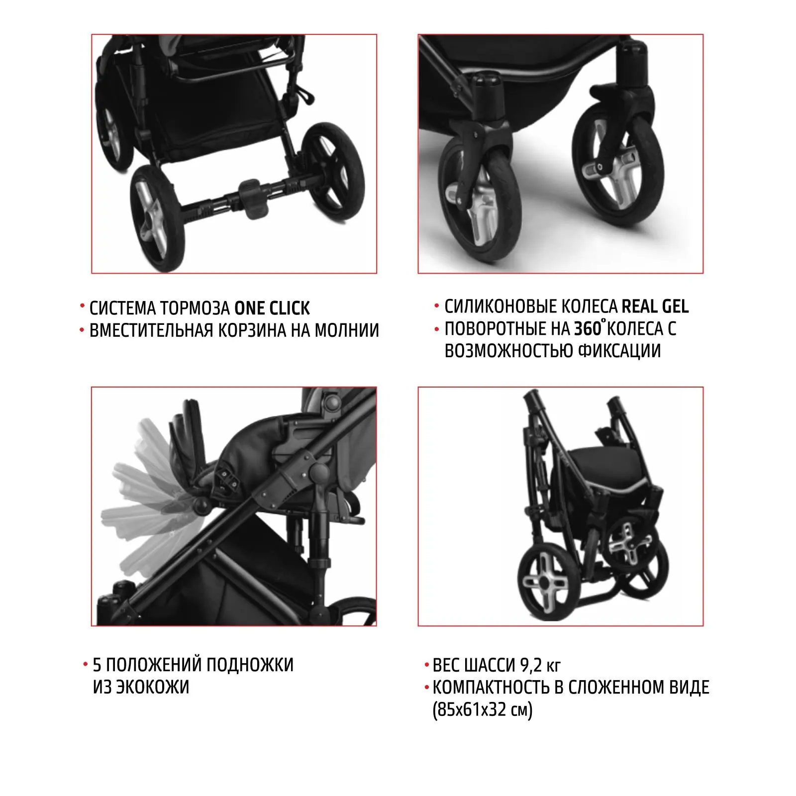 Наружное покрытие модулей, подножка, бампер и ручки выполнены из экокожи. Это практичный материал, лёгкий в уходе и устойчивый к выцветанию. Внутренняя обивка люльки - х/б ткань с синтепоном, капор – текстиль. Прочное шасси из алюминия окрашено в элегантный чёрный цвет, который отлично сочетается с расцветками съёмных модулей.