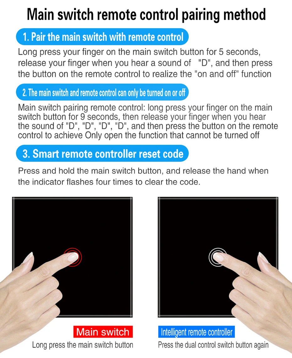 Переключатель RF433 в сочетании с сенсорным пультом дистанционного управления: (подробнее см. В руководстве). Когда есть звуковой сигнал, нажмите и удерживайте кнопку переключения в течение 3 секунд, затем нажмите пульт дистанционного управления, чтобы узнать сигнал. Открыть/закрыть Дает звуковой сигнал. "On" делает Два звуковых сигнала. "Off" делает три звуковых сигнала. "Удалить" делает четыре звуковых сигнала