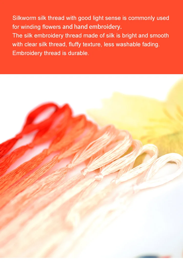 Шелковая нить шелкопряда, хороший светильник, обычно используется для намотки цветов и ручной вышивки. Шелковая нить для вышивки из шелка яркая и гладкая. С прозрачной шелковой нитью, пушистой текстурой, менее моющиеся выцветания. Нить для вышивки прочная. Материал: 100% шелк 100% чистый новый. Длина: около 20 метров. Назначение: вышивка крестиком, ручная вышивка, одежда, изделия ручной работы и т. Д.