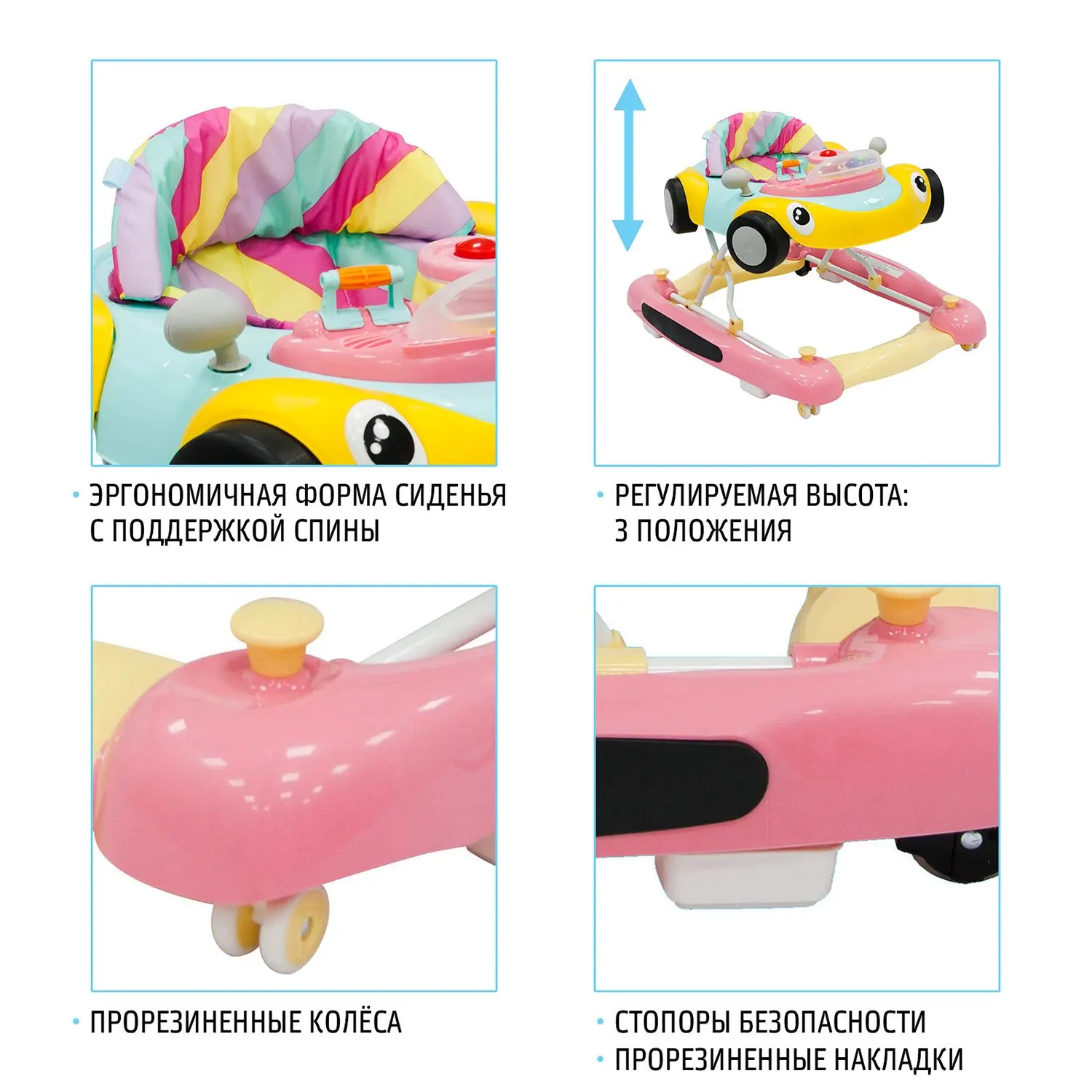 Предусмотрена регулировка высоты сиденья в 3-х положениях, это позволяет подстраивать ходунки под рост ребенка, и способствует правильной постановке стопы при передвижении. Присутствует надежный фиксатор блокировки от самопроизвольного складывания.