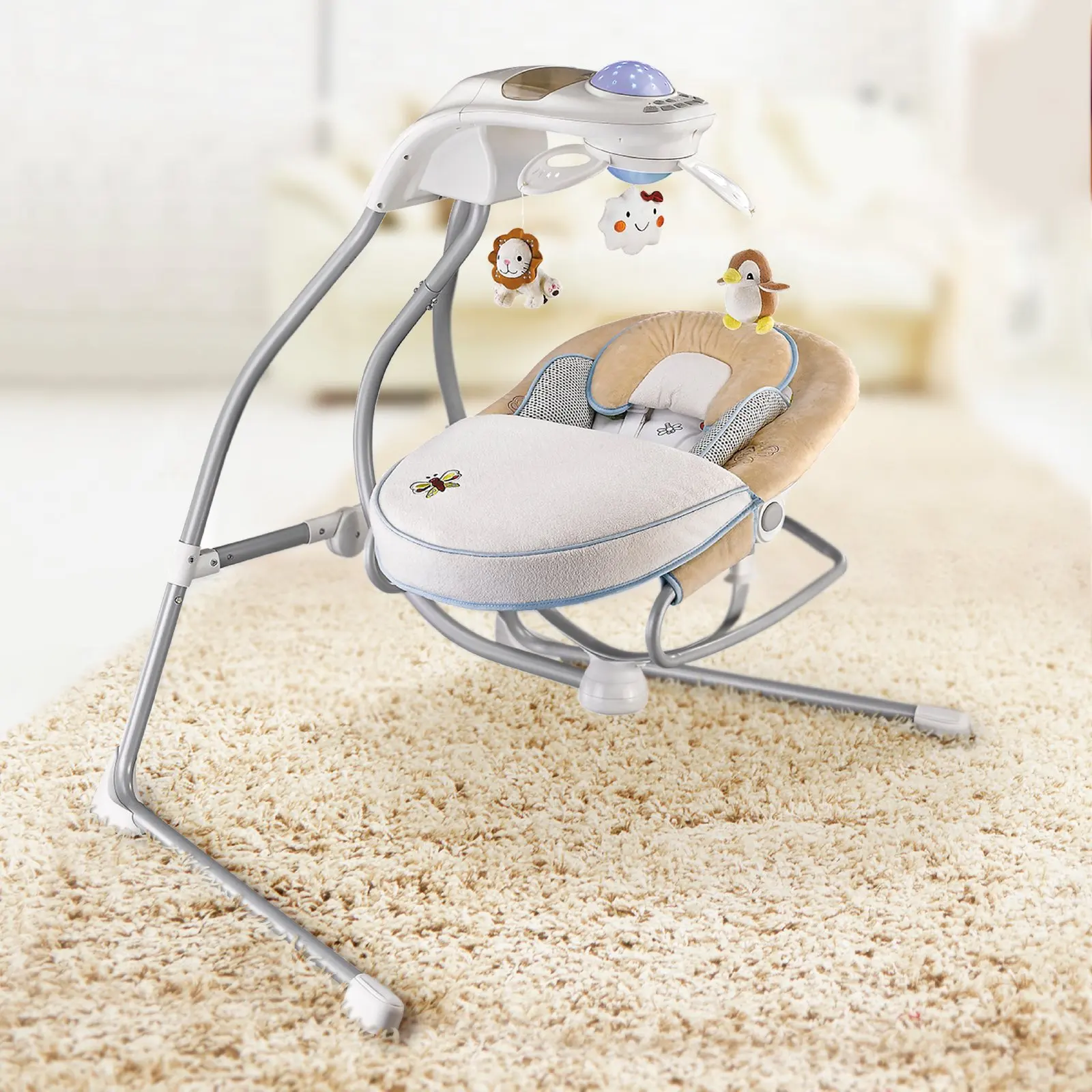 Поворотная конструкция сидения, деликатное укачивание в нескольких режимах и очаровательный вращающийся мобиль — незаменимая развивающая игрушка для новорожденного — дополняют перечень преимуществ этой модели. Завершают образ изящные линии основания и нежные, пастельные расцветки.