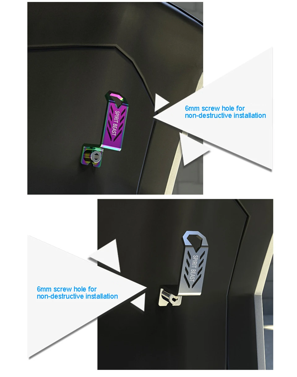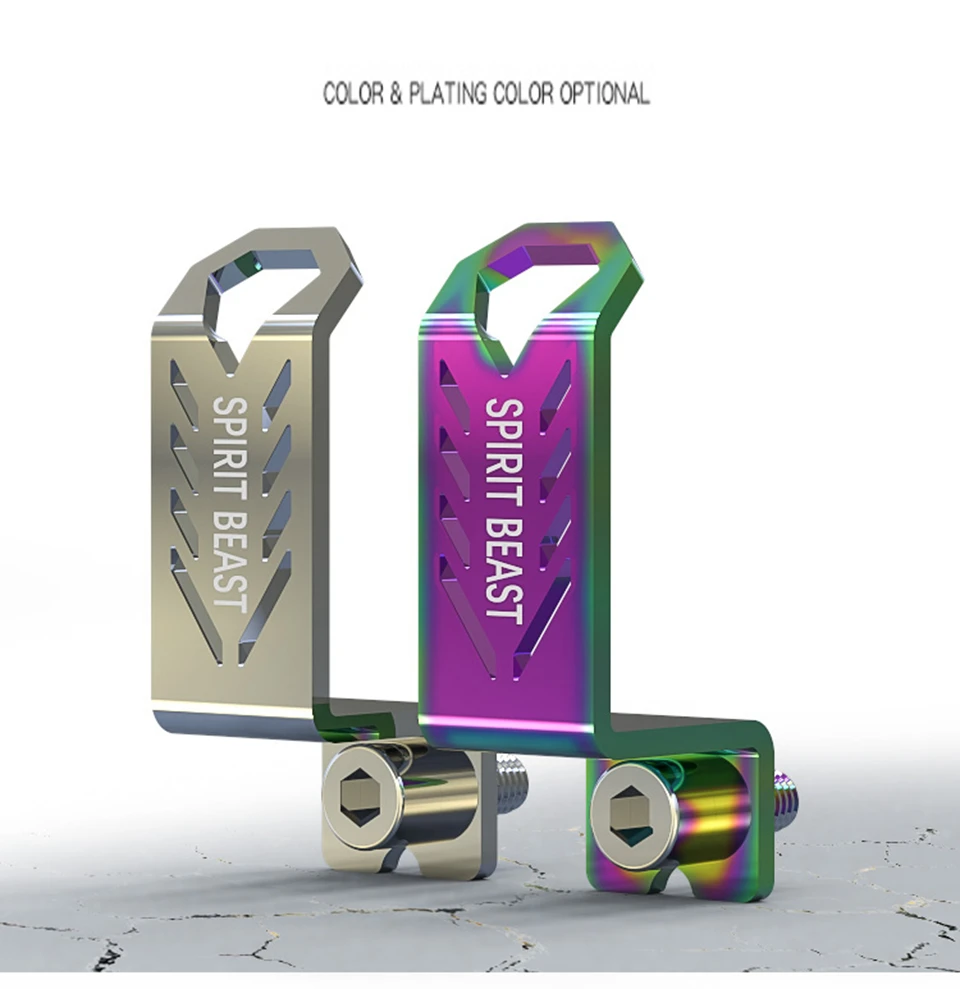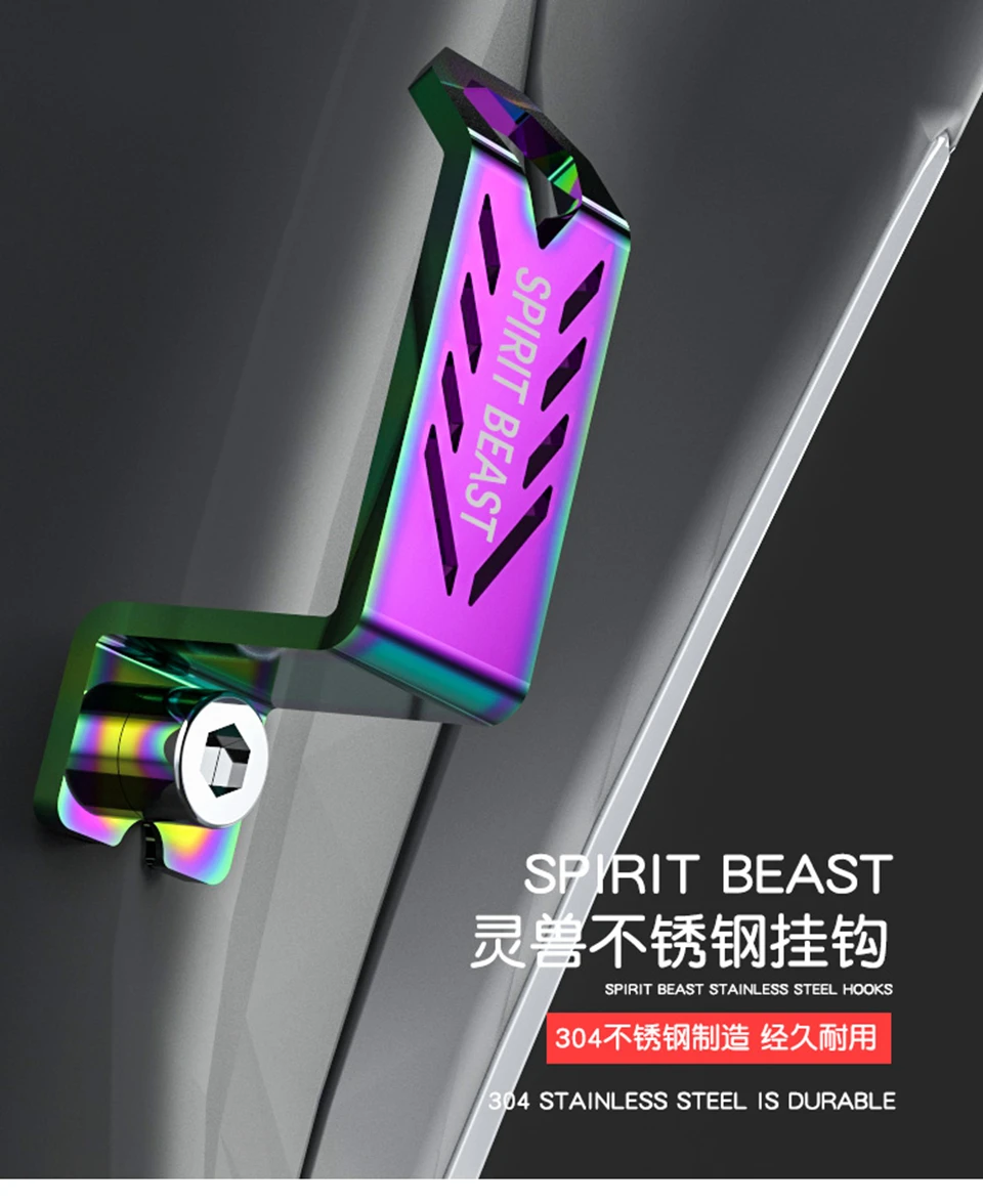 Product Name: Spirit Beast Stainless Steel Hook L8 Product material: 304 stainless steel Product Quantity: One pcs Product application: 6mm screw hole Product features: Made of 304 stainless steel, fantasy color matching, drawing process, vacuum ion plating and other technologies, streamlined appearance design, laser printing, cutting, and LOGO engraving. Reminder: The color will be different due to the amount of ambient light and the angle, which will cause the picture to deviate from the actual product! Please understand.