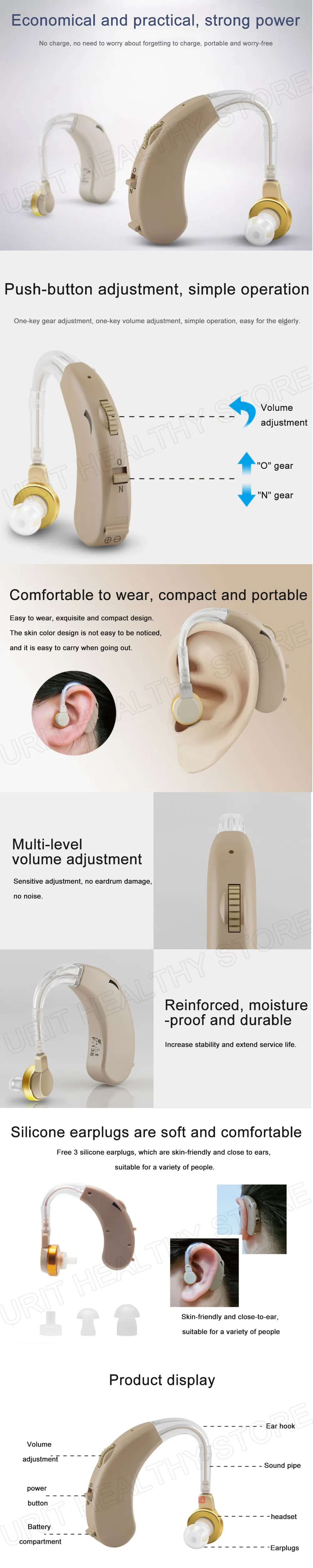 1. Слуховой аппарат BTE 2. Максимальный звуковой выход: 129 дБ ± 4 дБ 3. Максимальное усиление звука: 50 дБ ± 5 дБ 4. Гармоническое искажение волны: ≤ 5% 5. Частотный диапазон: 450 ~ 3500 Гц 6. Входной шум: ≤ 30 дБ 7. Батарея: батарейка AG13 (входит в комплект) 8. Рабочее напряжение: 1,5 в 9. Рабочий ток: ≤ 4 мА 10. Цвет: как показано на рисунке 11. Размер изделия: 6,75x4,35x1,9 см 12. Посылка: 10x8x3,5 см 13. Вес нетто: 7 г