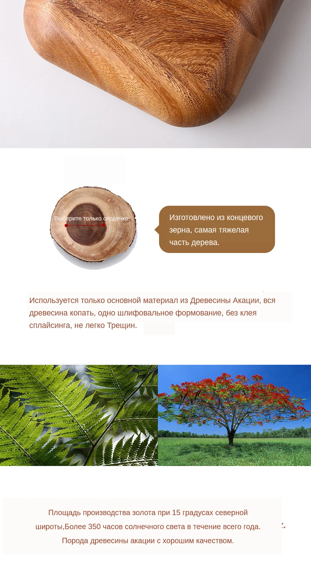 Древесина акации является естественной защитой от плесени и антибактериальной. Гель, производимый Акацией, обладает антибактериальным, противовоспалительным, антивирусным и другим высоким лекарственным значением. Круглый год солнце Золотодобывающая площадь при 15 градусах северной широты, более 3500 часов солнечного света в течение всего года. Порода древесины акации с хорошим качеством. Древесина-это натуральный продукт, содержащий естественные отклонения по внешнему виду. Поверьте, что ваш предмет будет иметь свое красивое уникальное зерно и цвет.