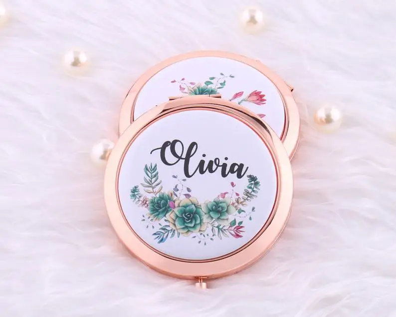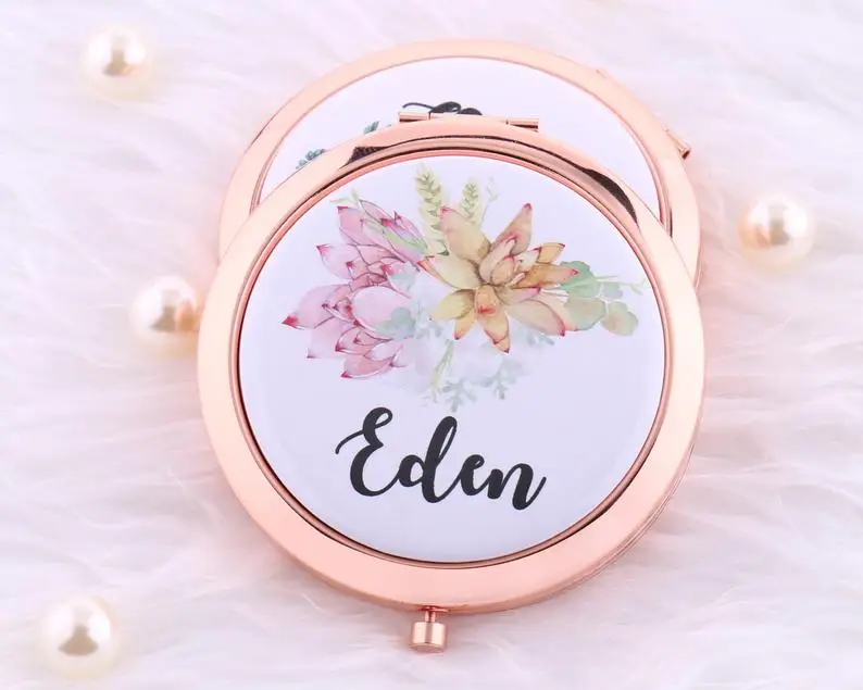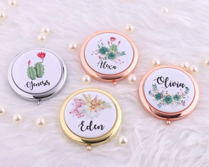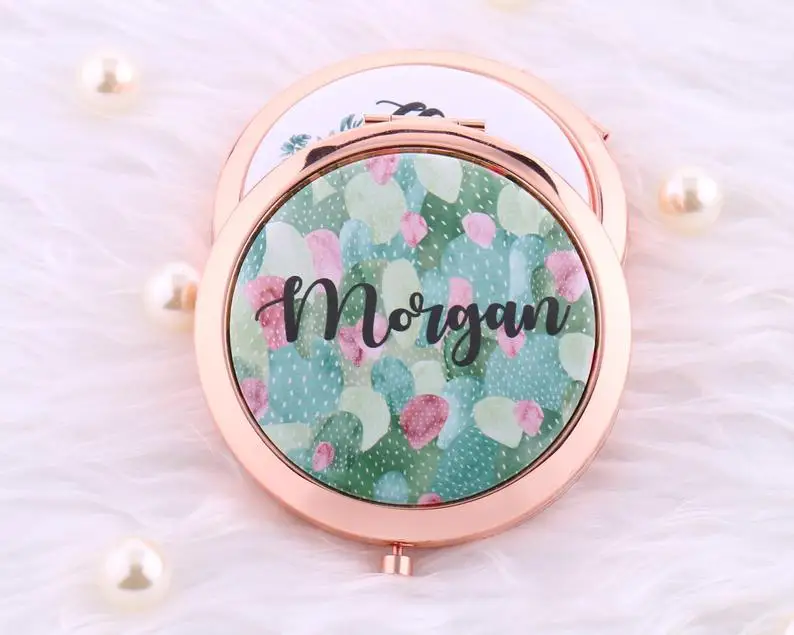 Это очаровательное компактное зеркало отлично подходит для девичника, вечерние, свадебный душ или Подарок на годовщину и т. д. напечатаны с вашим именем на выбранном сочном/кактусовом фоне, они являются действительно уникальным подарком. Внутри два зеркала, один из которых имеет постоянную силу, а другой имеет увеличительную мощность 2x. Компактный размер 2,75 "и идеально подходит для кошелька.
