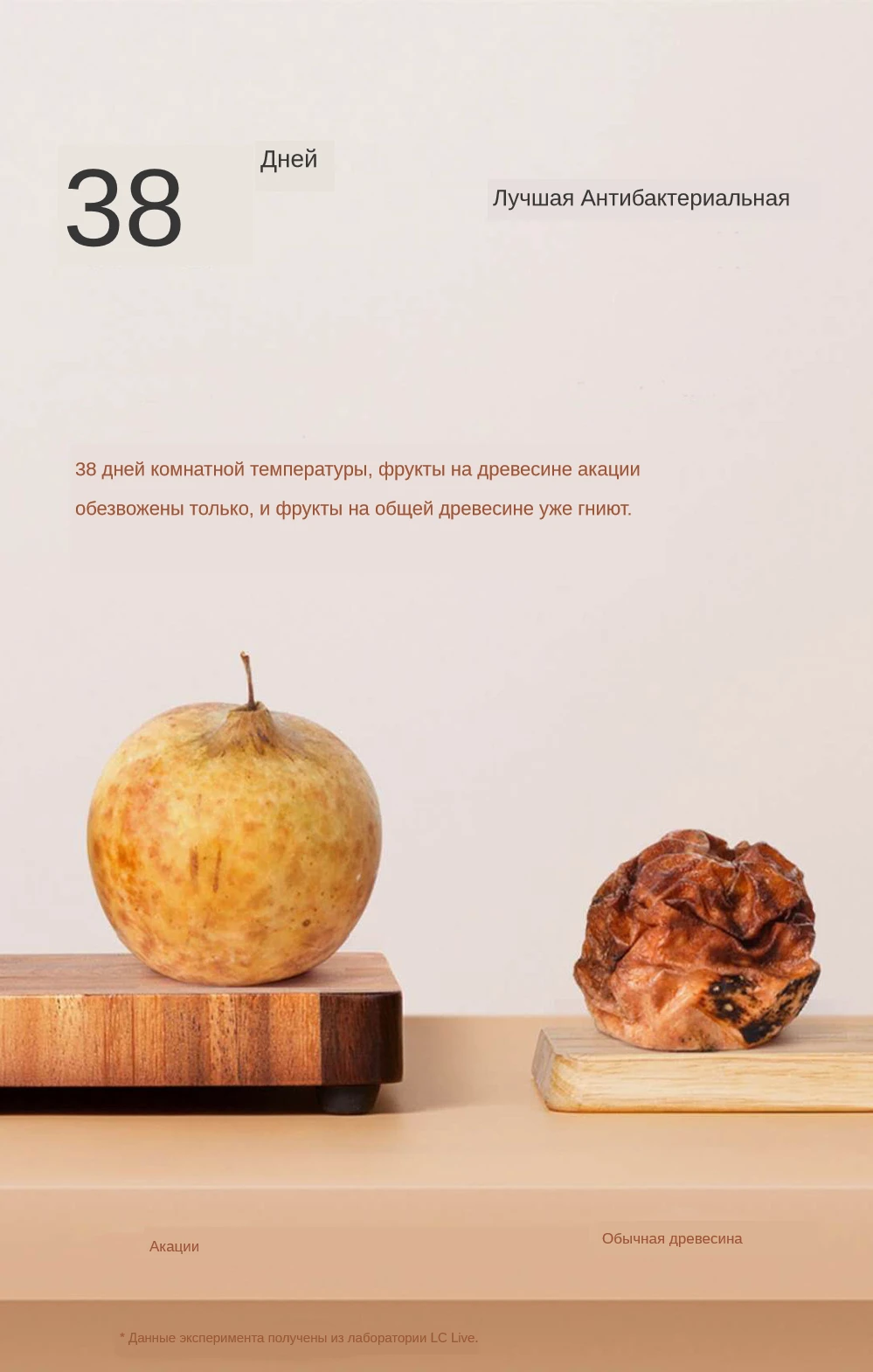 38 дней при комнатной температуре, фрукты на древесине акации обезвожены только, и фрукты на общей древесине уже гниют. SGS лабораторная Сертификация в Swit. Антибактериальный и защита от плесени отчет о проверке качества. Продукт был протестирован лабораторией SGS в Швейцарии, экспериментальные данные показывают, что продукт имеет анти-плесень и антибактериальный эффект.