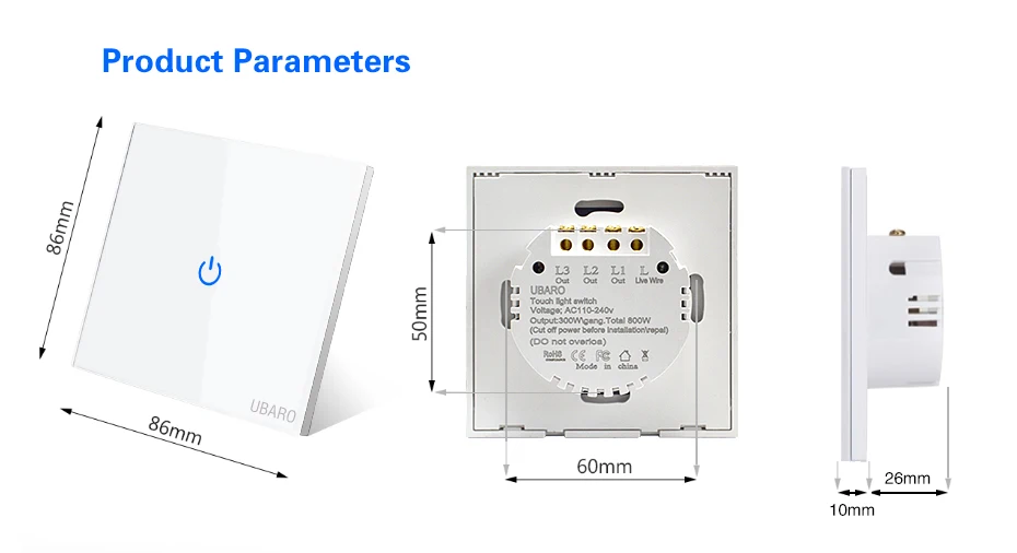 1. Наименование бренда: UBARO 2. Кнопка: 1 пост, 2 пост, 3 пост на ваш выбор 3. Цвет: черный, белый, золотой 4. Размер: 8,6*8,6*3,5 см/3,4*3,4*1,4 дюйма (Д * Ш * В) 5. Ток: 10 А 6. Мощность: 3-300 Вт/комплект 7. Рабочее напряжение: 170-240 В переменного тока 8. Рабочая температура: -20 ℃ ~ + 70 ℃ 9. Относительная влажность: 10% ~ 90% 10. Механический срок службы: 100000 раз 11. Сертификация: CE,CCC ,ROHS 12. Гарантия: 1 год 13. Срок доставки: <3 дня получения вашего заказа 14. Вес брутто: 0,15 кг/5,25 унции Вес нетто: 0,14 кг/4,9 унции 15 、 посылка Размеры: 9,0*9.0x4.0 см/3,5x3,5x1,55 (Д * Ш * В)