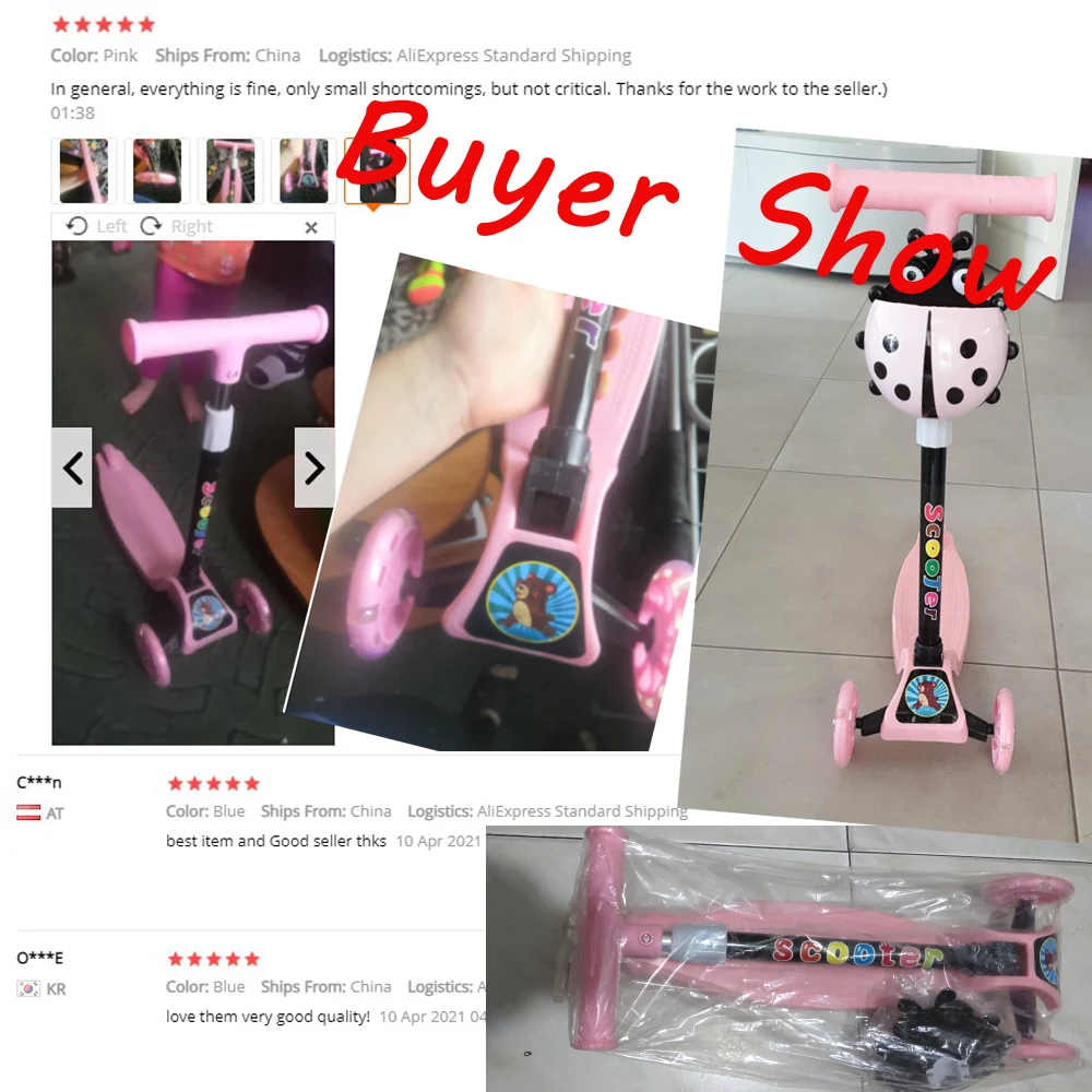 1. При достижении определенной скорости, колеса будут светиться, контролируя направление, встряхивая тело, не волнуйтесь сначала, Скутер имеет три колеса, и ребенок не будет падать. 2. Есть складывающаяся кнопка рядом с передним колесом скутера, пожалуйста, откройте его вручную после нажатия. 3. Если детали повреждены, пожалуйста, свяжитесь со службой поддержки клиентов.