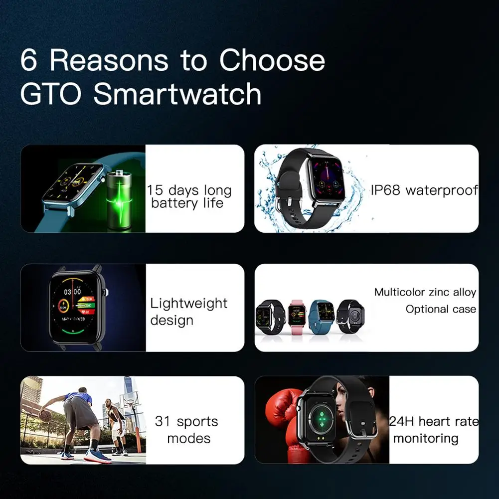 Характеристики:Бренд: KOSPETМодель: GTOРазмер дисплея: 1,4 дюйма (квадратный экран)Тип экрана: TFTBluetooth: версия 4,2Разрешение: 320*320Датчик пульса: Да (HRS330)Датчик G: Да (LIS2DH12TR)Сенсорный режим: один сенсорный экранЦвет: черный/синий/розовыйМатериал корпуса: металл и IMLМатериал ремешка: силиконОперационная система: N/AСистема поддержки: для Android 5,1, для IOS 9,0 и вышеПроцессор: NRF52832Память: 64 КбПЗУ: 64 МбКамера: N/AЗаявление: не применимоМикрофон: N/AМотор: ДаGPS: не применимоФункции:Несколько спортивных режимов: Встроенный 31 вид спортаМониторинг здоровья: пульсометр, Монитор кислорода в кровиМониторинг сна: ДаДругие функции: SMS-напоминание, шагомер, погода, секунды, управление изображением, управление музыкойЯзыки пользовательского интерфейса просмотра: английский, немецкий, французский, испанский, русский, японский, корейский, украинский, турецкий, португальский, индонезийский, китайский (упрощённый), традиционный китайскийЯзыки применения: упрощенный китайский, традиционный китайский, английский, японский, французский, немецкий, испанский, итальянский, португальский, датский, русский, чешский, польский, тайский, шведский, финский, голландский, корейскийРазмер часов:Размер: около φ 45 мм * 33,5 мм * 9,5 мм/1,77*1,32 * дюймаДлина: Около 246 ммРемешок: около 88 мм * 22 мм/3,46*120 дюйма; Около 4,72 мм * 22 мм/* дюймаУровень водонепроницаемости: IP68Аккумулятор: 170 мАчТип батареи: полимерный аккумуляторВремя ожидания: в режиме ожидания: 15 днейЕжедневное использование: 5-7 днейРазмер упаковки: около 98 (Д) мм x 88 (Ш) мм x 49 (В) мм/3,86*3,46 * 1.93inУпаковочный лист:1 * часы для KOSPET GTO1 * зарядный кабель2 ремешка2 * защитная пленка1 * Руководство пользователя