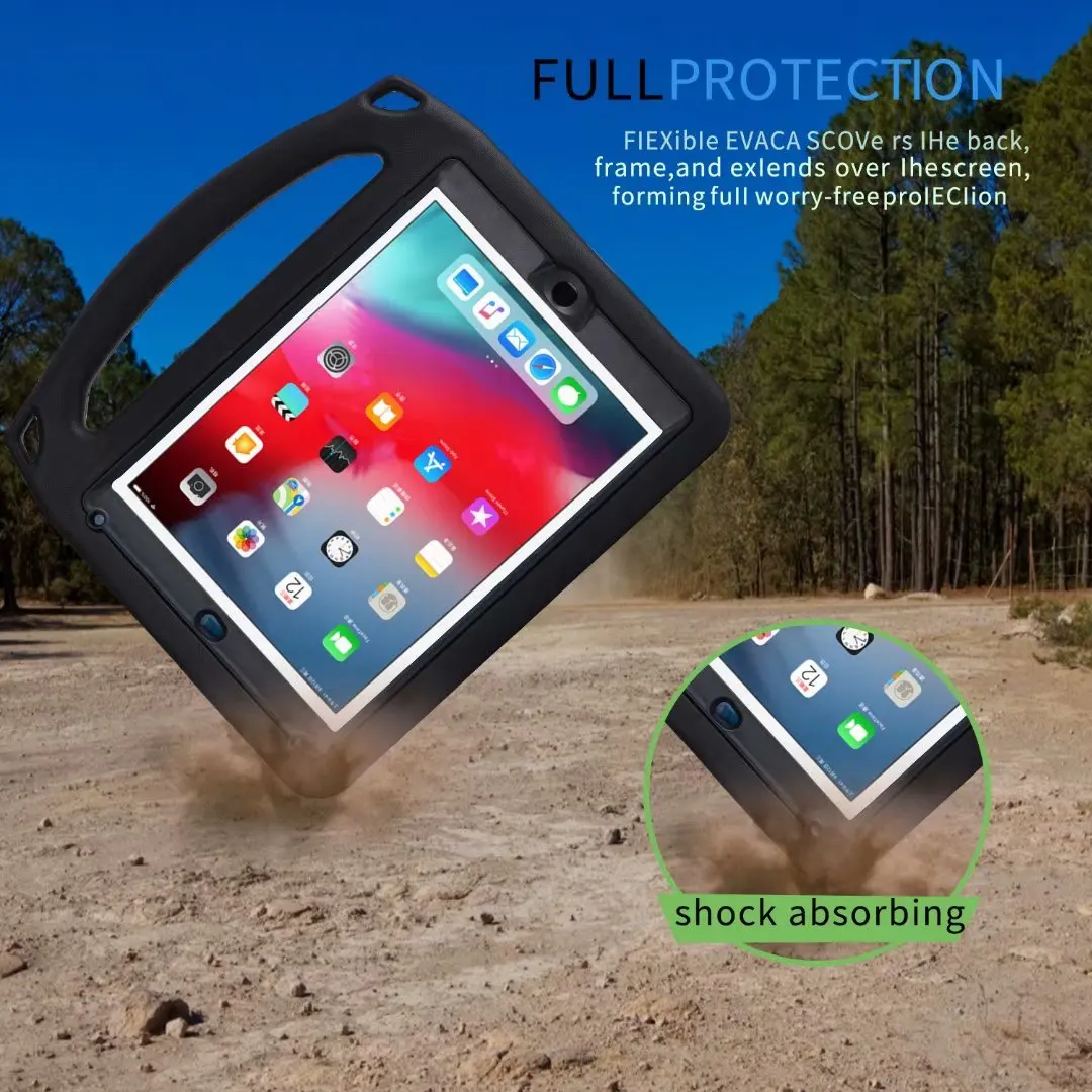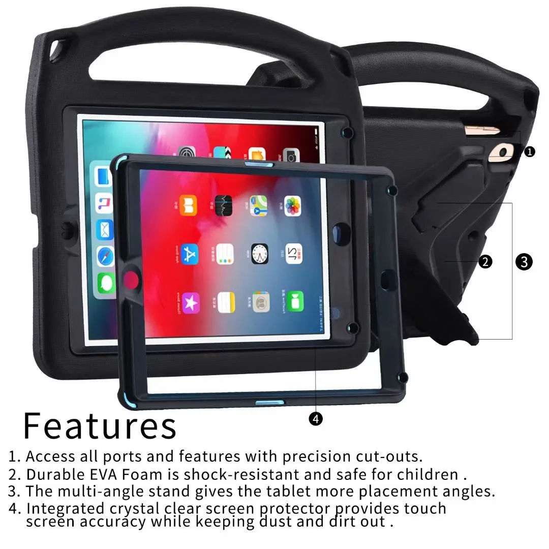 Изготовлен из высококачественного нетоксичного плотного вспененного материала EVA с прочной поверхностью оправы. Обеспечивает дополнительную амортизирующую, пылеотталкивающую, противоскользящую, защиту от отпечатков пальцев и царапин. Гибкая пена покрывает заднюю часть, рамку и простирается над экраном. Рукоятка обеспечивает дополнительную безопасность, а также может быть сложена обратно в подставку для горизонтального просмотра полный доступ ко всем портам, кнопкам и камерам без необходимости снимать чехол. Высококлассная технология впрыска топлива, устойчивая к царапинам Безопасный Чехол для детей. Амортизирующая, пылеотталкивающая, противоскользящая, защита от отпечатков пальцев и царапин. Пусть Детям нравится играть, не беспокоясь о повреждении или царапании. EVA ударопрочный чехол для ручки. Для ipad 9,7 дюйма 2017/2018 (A1822/A1823/A1893/A1954) Для ipad Pro 9,7 дюймов 2016 (A1673/A1674/A1675) Для ipad Air/5 (A1474/A1475/A1476) Для ipad Air/6 (A1566/A1567)