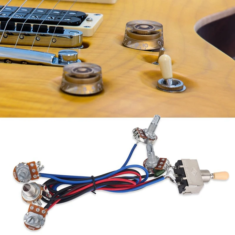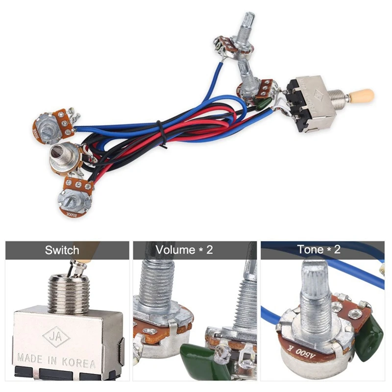 Схема проводки, как показано на седьмом изображении, Этот жгут полностью предварительно подключен. Все, что вам нужно сделать, это припаять свои пикапы к выключателю и Заземлить их в объемные горшки.