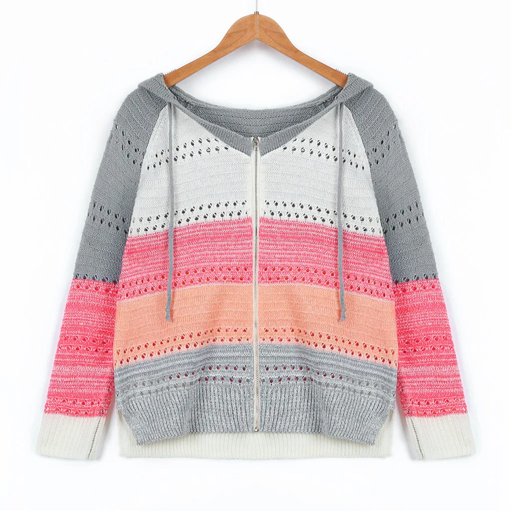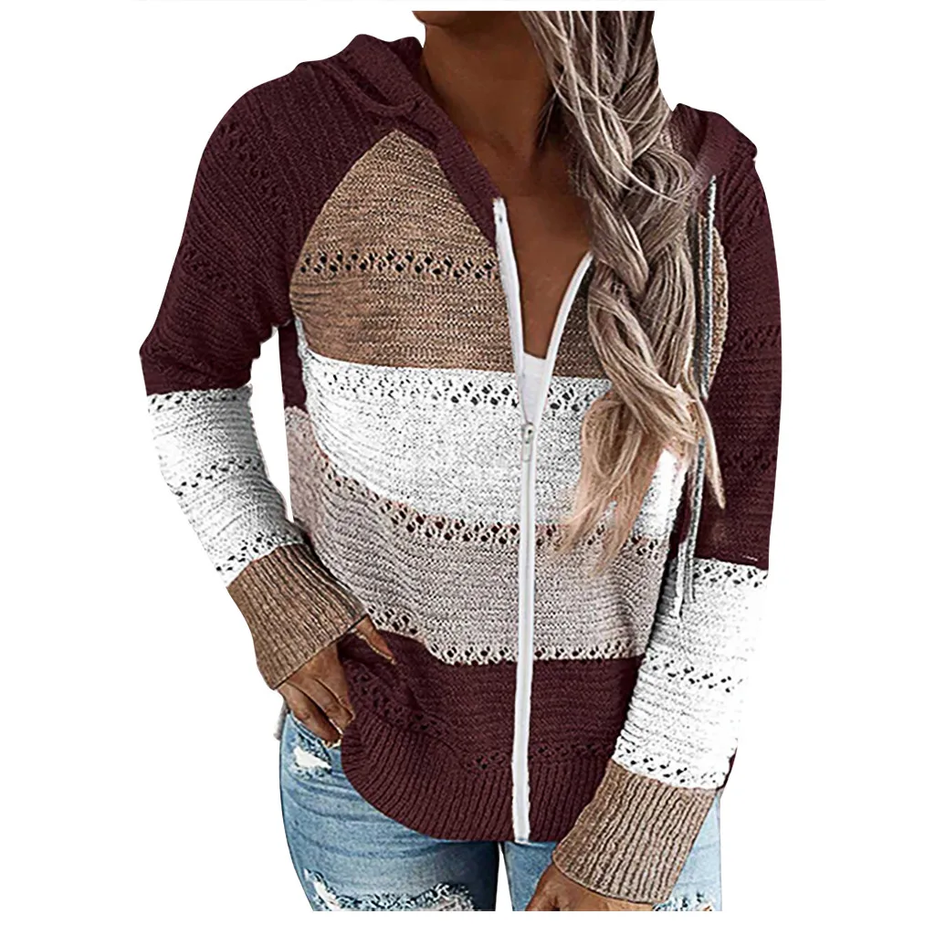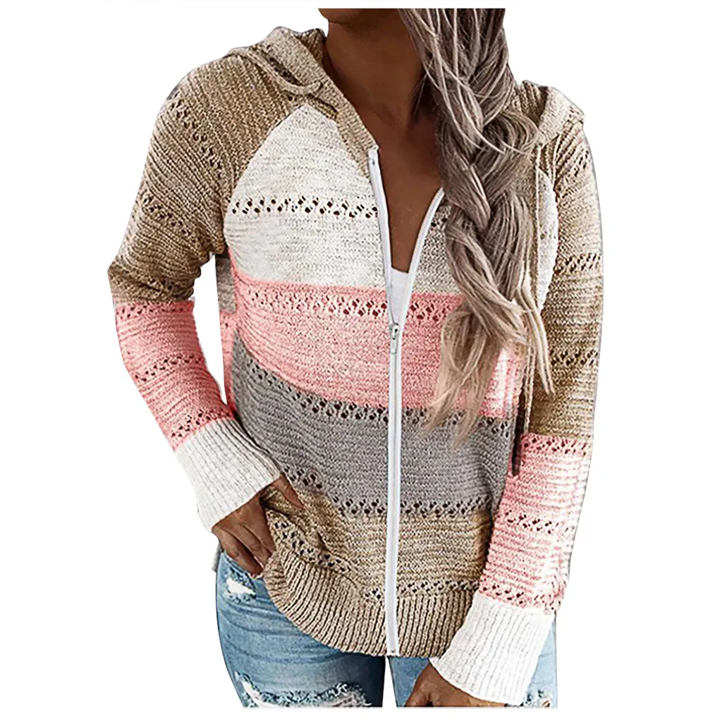 Fashion Women Casual Patchwork Long Sleeves Hooded Sweater Cardigan Blouse Tops