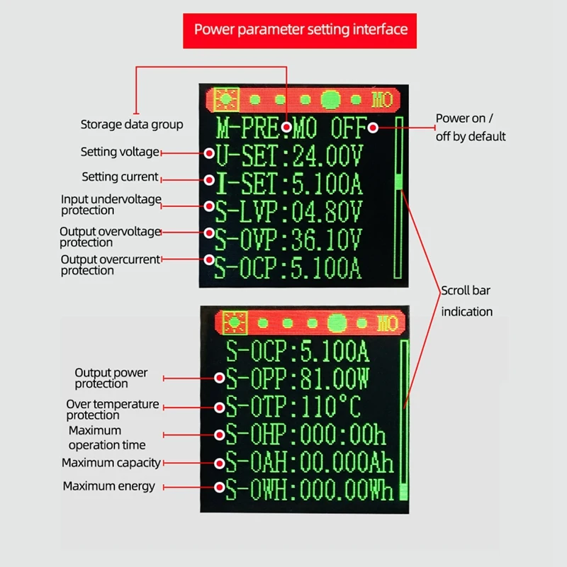 В интерфейсе настройки параметров питания выберите группу данных и поверните кодирующий потенциометр, чтобы вызвать соответствующую группу данных;