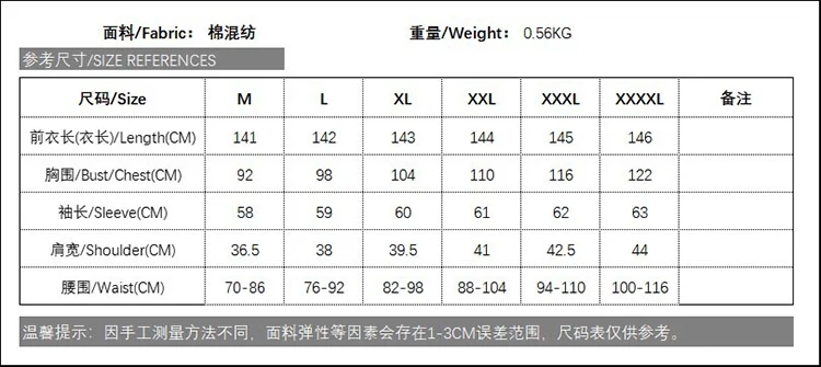 2XL: ширина плеч 41 см, обхват груди 110 см, обхват талии 88 ~ 104 см, длина рукава 61 см, длина 144 см