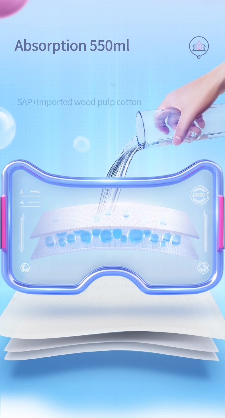 Особенности: 1. Высококачественный Ультра мягкий верхний слой сохраняет сухую и удобную поверхность. 2. Текстура алмаза полезна для быстрого распределения и поглощения жидкости. 3. Двойной абсорбирующий сердечник предназначен для быстрой и прочной фиксации жидкости. 4. Защита от утечки PE задняя пленка с дышащим дизайном защищает от утечки и герметичности. 5. Высокое качество слова бренда SAP и пух целлюлозы эффективно уменьшает неприятные запахи и предотвращает бактериальный рост.