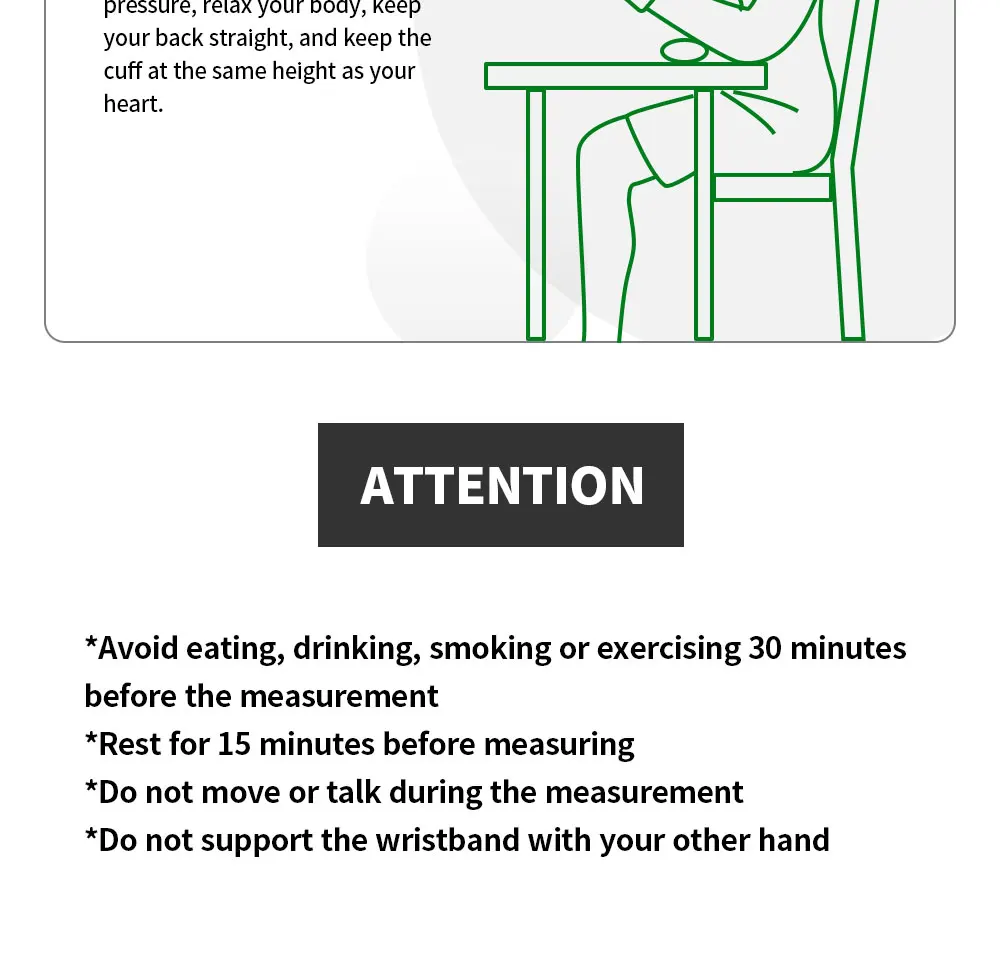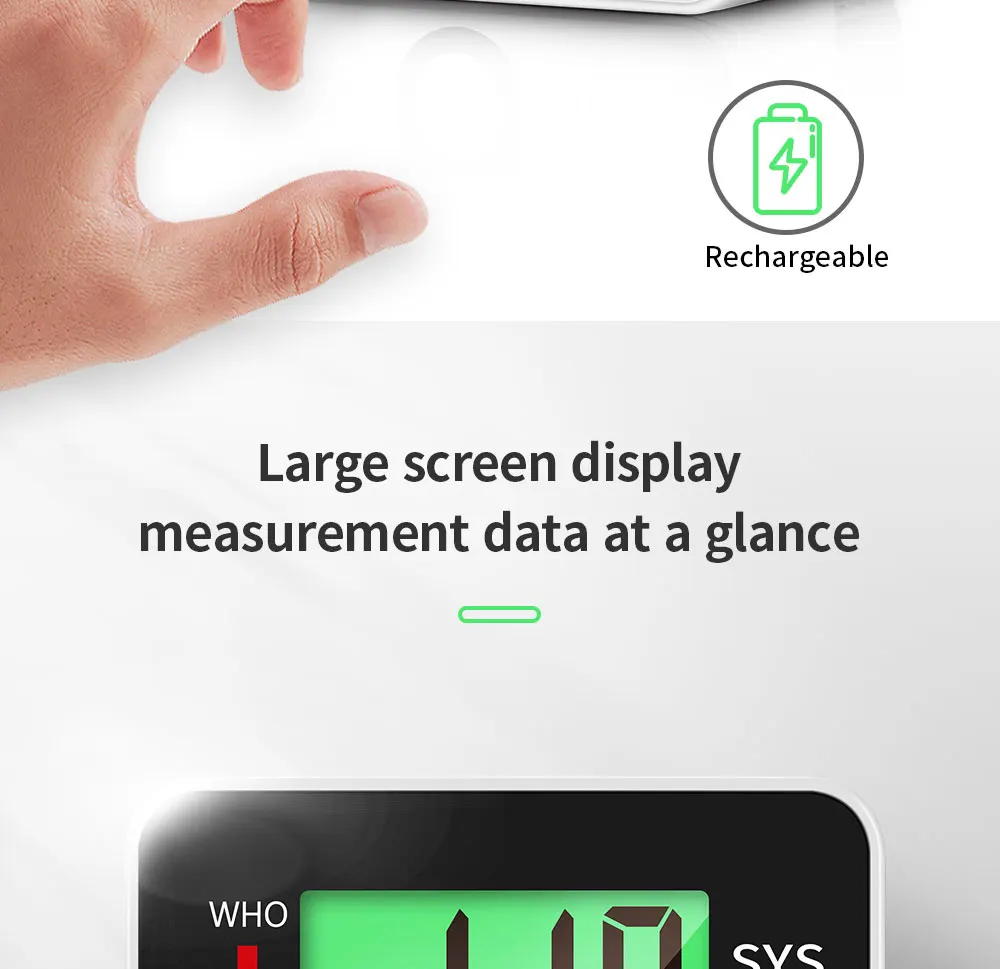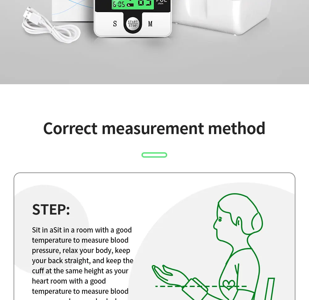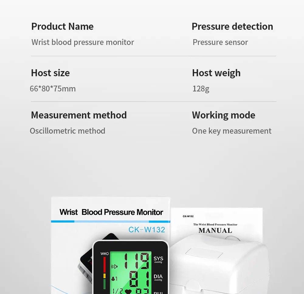 Параметры продукта: Бренд: OLIECO Размер: 66*80*75 мм Диапазон браслетов: 135 ~ 195 мм Источник питания: DC 3,5 V 0.5A Режим отображения: цифровой ЖК-дисплей Диапазон измерения: Артериальное давление 0 ~ 280 мм рт. Ст. Пульс 40 ~ 199 ударов/мин Метод давления: Автоматическая откачка Метод декомпрессии: Соленоидный клапан для контроля декомпрессии Погрешность измерения: Артериальное Давление ± 3 мм рт. Ст. Частота сердечных сокращений ± 5% Объем хранения: 2*99 наборов данных измерений и времени Датчик давления: полупроводниковый датчик давления Источник питания: литиевая батарея Интервал измерения: 1 мм рт. Ст. Рабочая температура и влажность: + 10 ° C ~ + 40 ° C / 40% ~ 85% R.H. Температура хранения и влажность: -20 ~ ° C + 50 ° C / 15% ~ 90% R.H. Время зарядки: около 3 часов, около 280 раз Характеристика: ※ Просты в эксплуатации Measure Измерьте соединение запястья, интеллектуальное сжатие HD английская Голосовая передача, голосовые подсказки, нормальное ли кровяное давление и пульс Built встроенный литиевый аккумулятор, может использоваться много раз после полной зарядки ※ Зарядка от USB, отсутствие загрязнения, защита окружающей среды и быстрая, надежная ※ Трехцветный экран с подсветкой показывает, является ли кровяное давление нормальным в зависимости от цвета, и показания экрана могут быть четко видны в темноте ※ Защита от перенапряжения WHO Предупреждение ющая полоса для определения состояния здоровья артериального давления ВОЗ Function функция напоминания о аритмии 99 99 наборов функций хранения данных для двух человек Query запрос данных памяти в последовательности ※ ЖК-дисплей высокой четкости Automatic Автоматическое выключение в течение 1 минуты Accuracy точность: Артериальное давление ± 3% Пульс ± 5% Range Диапазон измерения: Артериальное давление 0 ~ 280 мм рт. Ст. Пульс 40 ~ 199 ударов/мин Включает: Руководство * 1 Машина * 1 USB зарядка DC * 1 Коробка для хранения * 1