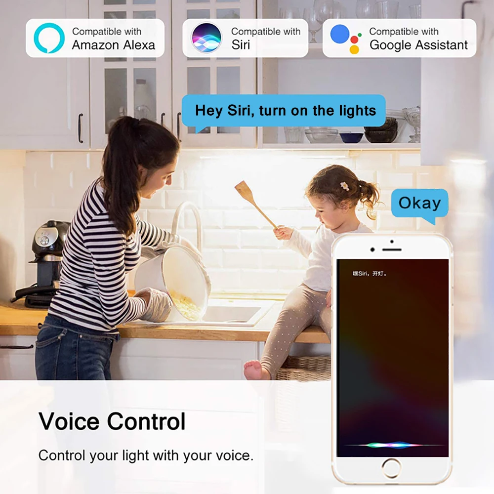 Эта лампа Wifi совместима одновременно с Homekit, Alexa Echo, Google home, Tmall Elf, удобно управлять голосом.