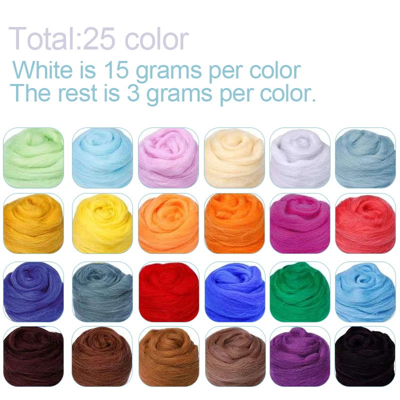 Название: 25 цветов Шерсть-ровинг набор для валяния игл Материал: шерсть + металл + дерево Тема: Игла DIY валяния Использование: шерстяные материалы для валяния Тип: шерстяное войлочное волокно Особенности 1: прядильное плетение для вязания игл Feature2: принадлежности для вязания игл для DIY Особенности 3: Шерстяное волокно; Игла для валяния Особенности 4: пряжа из волокон и шерсти