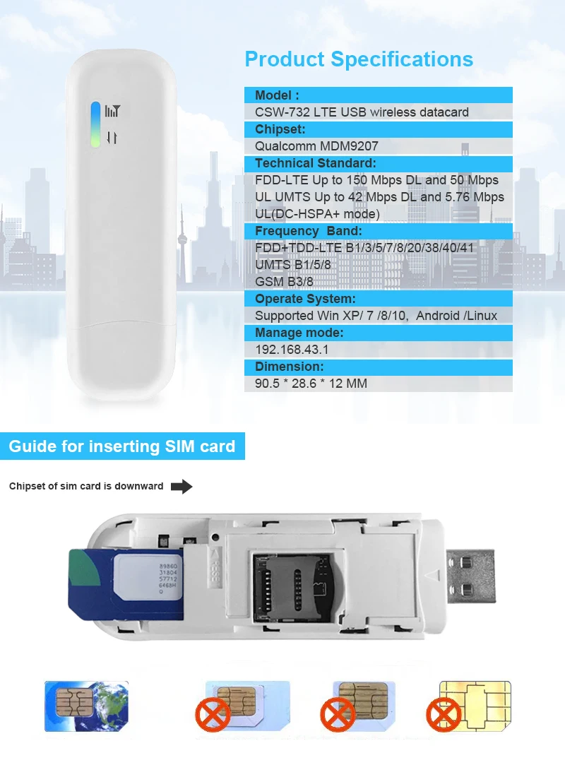 CSW-732 донгл-это не только модем 4G, он может работать как маршрутизатор WiFi, его функция очень похожа на Модем wifi Huawei 3372/8372. При подключении к адаптеру питания или мобильному питанию. Он может передавать сигнал Wi-Fi и позволяет безопасно подключать до 5 устройств, включая планшеты, компьютеры, мобильные телефоны и игровые устройства, В мобильную сеть 4G или при перемещении через Wi-Fi и 1 через интерфейс USB. Фактическая поддержка Wi-Fi составляет 802,11 b/g/n, до 10 устройств.