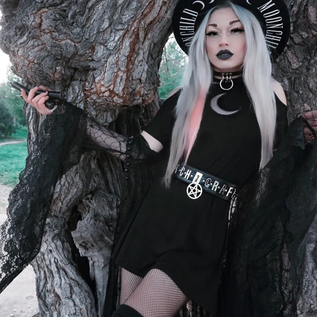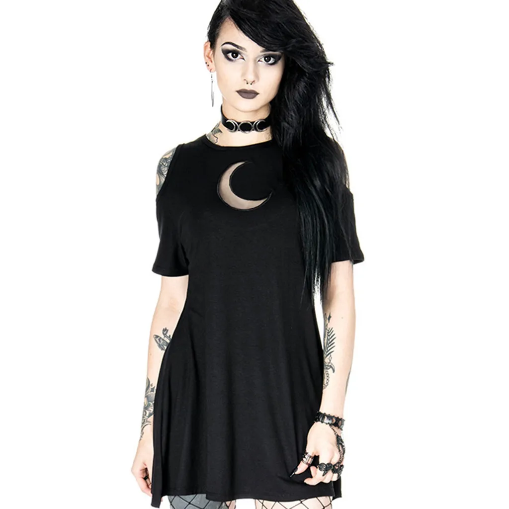Женское модное черное платье в готическом стиле в стиле панк с открытыми плечами и Луной