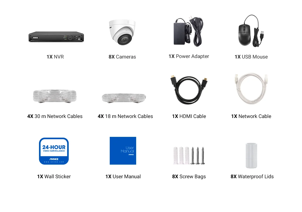 X1 NVRКамеры X8X4 30 м сетевой кабельX4 18 м сетевой кабельБлок питания X1USB мышь X1Руководство пользователя X1Сетевой кабель X1Кабель X1 HDMI(Жесткий диск на выбор)Если вы покупаете жесткий диск, пожалуйста, проверьте, установлен ли он в NVR, иногда, мы будем делать это. Любая проблема, пожалуйста, свяжитесь с нами.