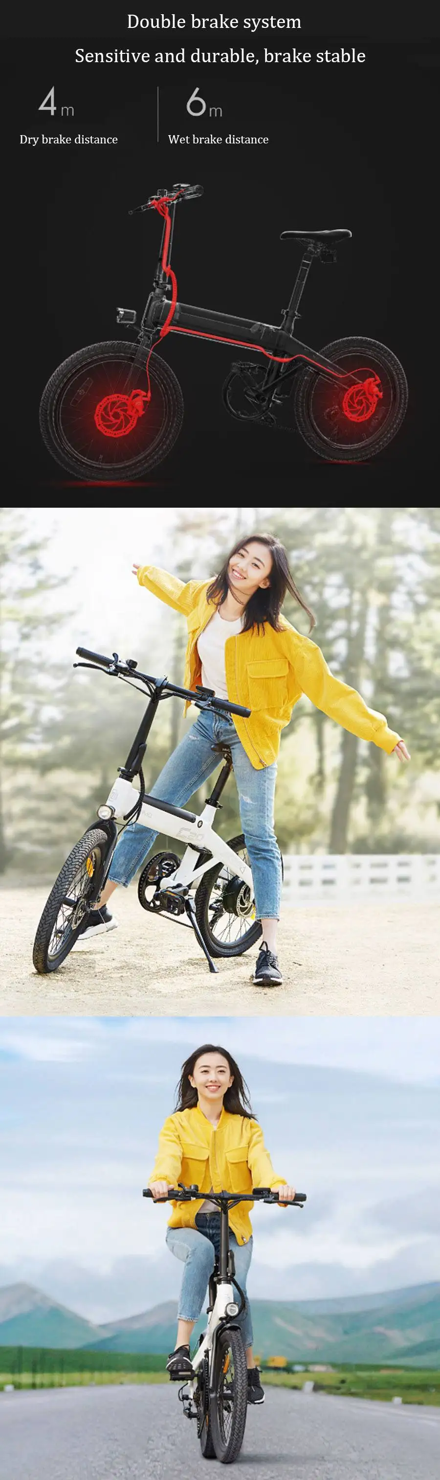 Brand HIMO Model C20 Front and rear wheel center distance 965m Highest design speed 23.7km/h Assisting cruising range More than 80km Power range About 50km 100 kilometers of electricity consumption 0.702kw/h Max load 100kg Size 1470 x 610 x 106mm Weight 21.1kg Type of battery Lithium Ion Battery Battery capacity 10Ah Battery voltage 36V Motor type DC brushless motor Power 250W Rated speed 380r/min Rated voltage 36V Overvoltage protection 31V Overcurrent protection 15A Color White, Grey