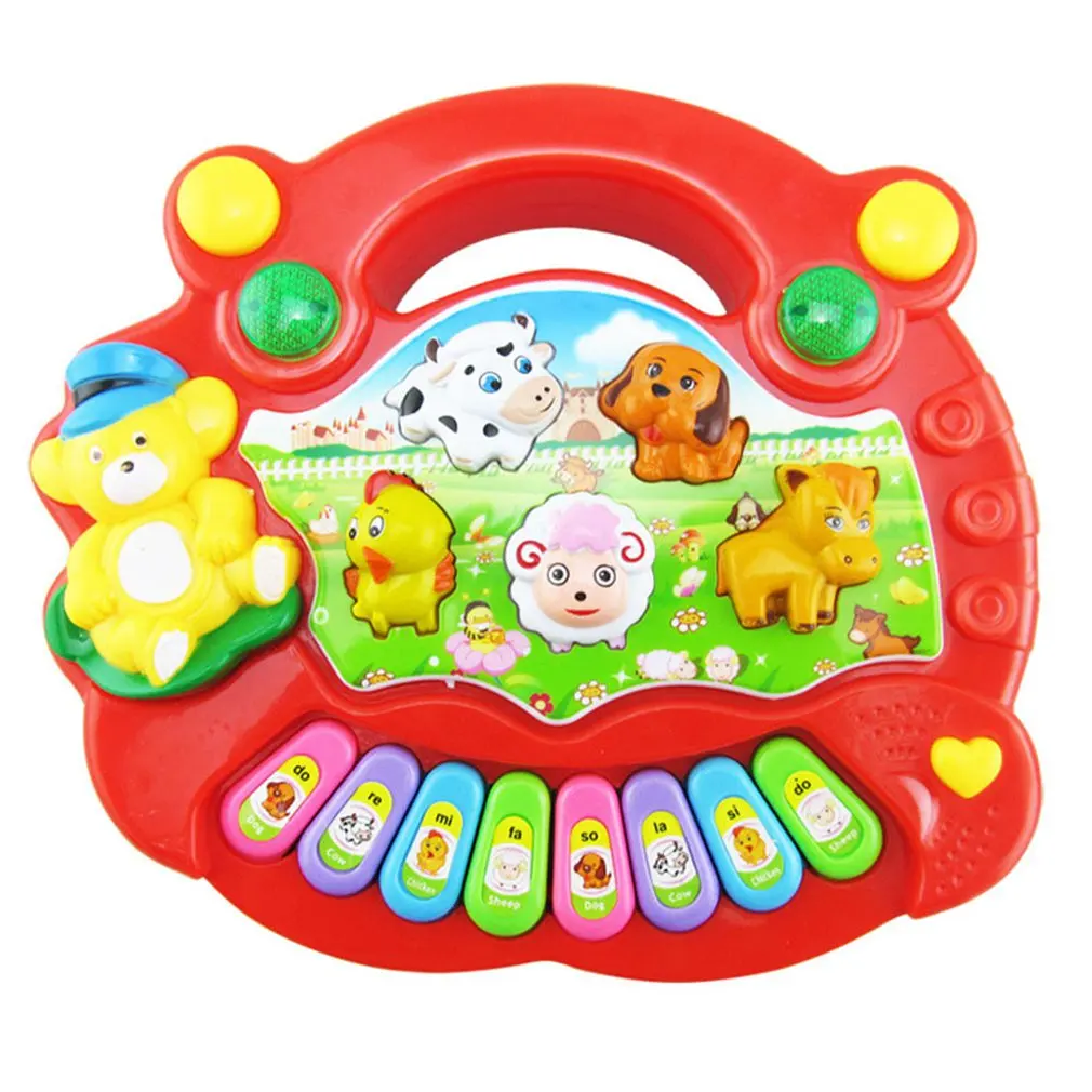 1. Детская музыкальная игрушка для фортепиано с животным фермой, верхняя часть с ручкой, и собаки, ягненок, курица, Даллас, пони пять животных кнопка.