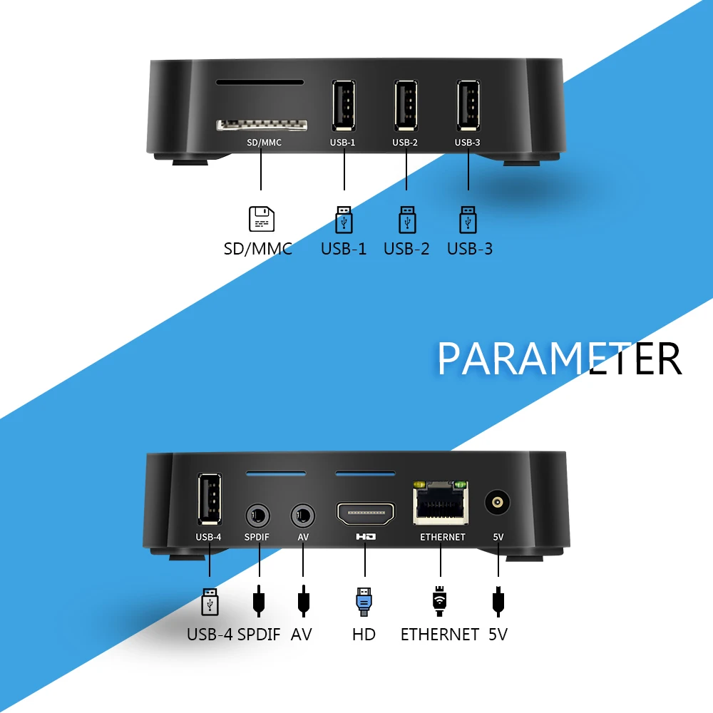 ТВ-приставка android со встроенным 2,4 Wi-Fi, Bluetooth 4,0, стандарт RJ-45, поддерживает уровни скорости сети 10 м/100 м, обеспечивает удобное подключение и более стабильный сигнал Wi-Fi, чтобы наслаждаться более качественным видео.
