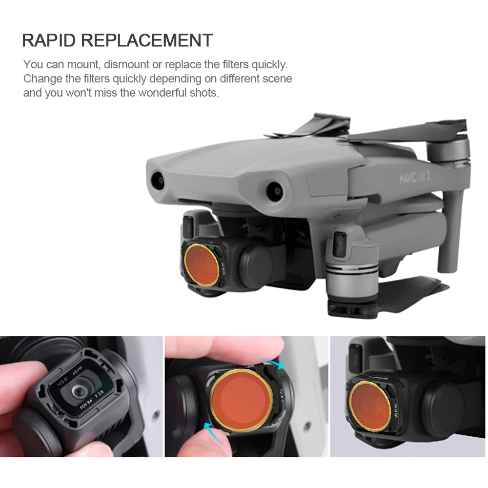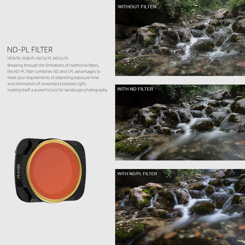 Our 4PCS premium filter set including an ND4-PL, an ND8-PL, an ND16-PL, and an ND32-PL filter is specifically designed for Mavic Air 2 drone. Its professional glass lenses are made from superior glass imported from Germany. Our filter set offers high transmittance while captures a clear image and restores true color. It effectively protect for your Mavic Air 2 camera even in harsh conditions and shoots some special effects. It is impeccable for air photography enthusiasts.