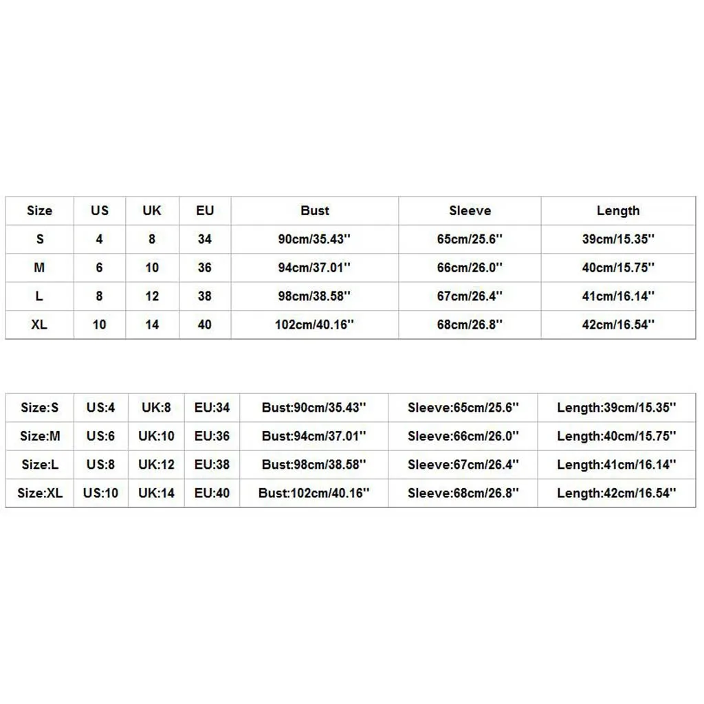 Размеры США Великобритания ЕС Бюст Рукав Длина S 4 8 34 90 см/35,43 дюйма 65 см/25,6 дюйма 39 см/15,35 дюйма М 6 10 36 94 см/37,01 дюйма 66 см/26,0 дюйма 40 см/15,75 дюйма L 8 12 38 98 см/38,58 дюйма 67 см/26,4 дюйма 41 см/16,14 дюйма XL 10 14 40 102 см/40,16 дюйма 68 см/26,8 дюйма 42 см/16,54 дюйма