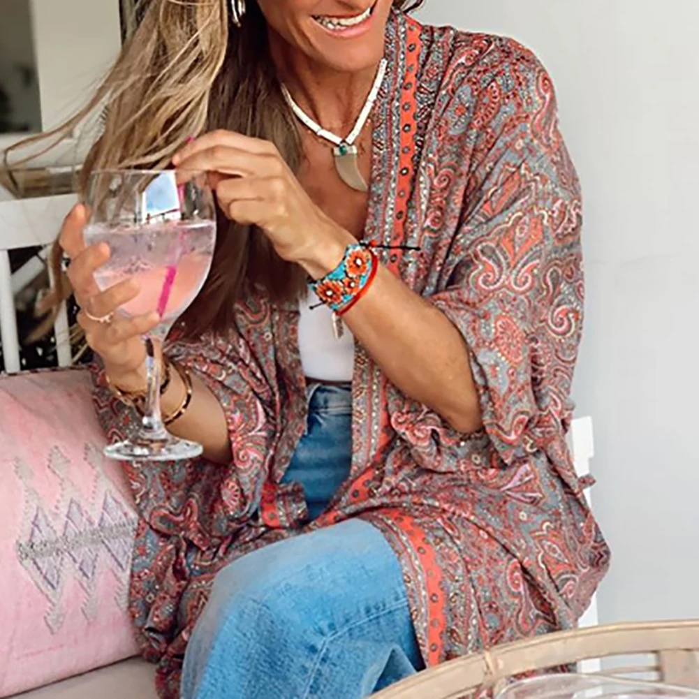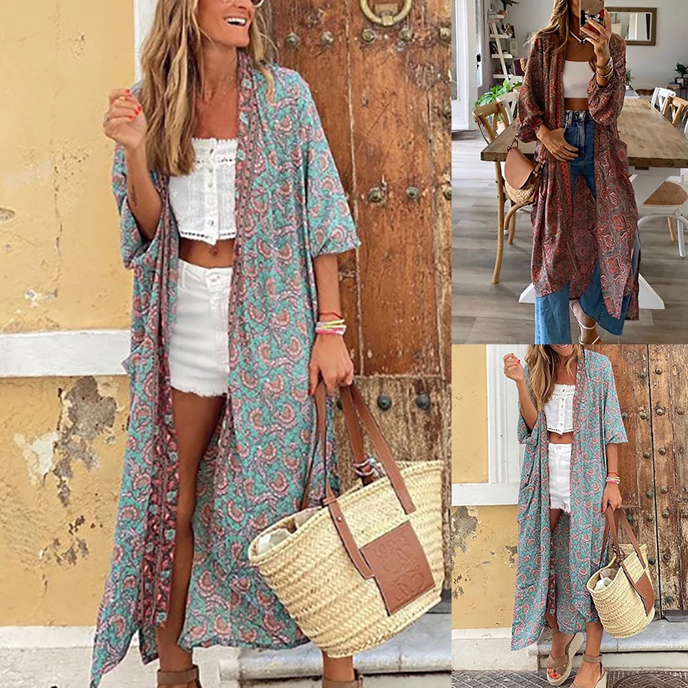 Женский кардиган Boho, длинный кардиган с рукавом 3/4 и цветочным принтом, кимоно, накидка, пальто