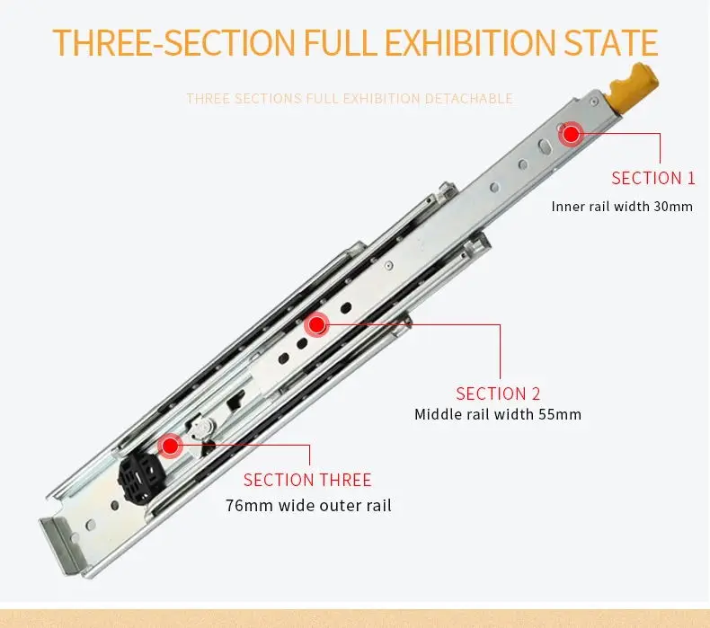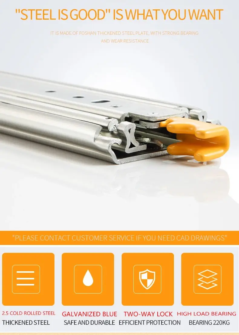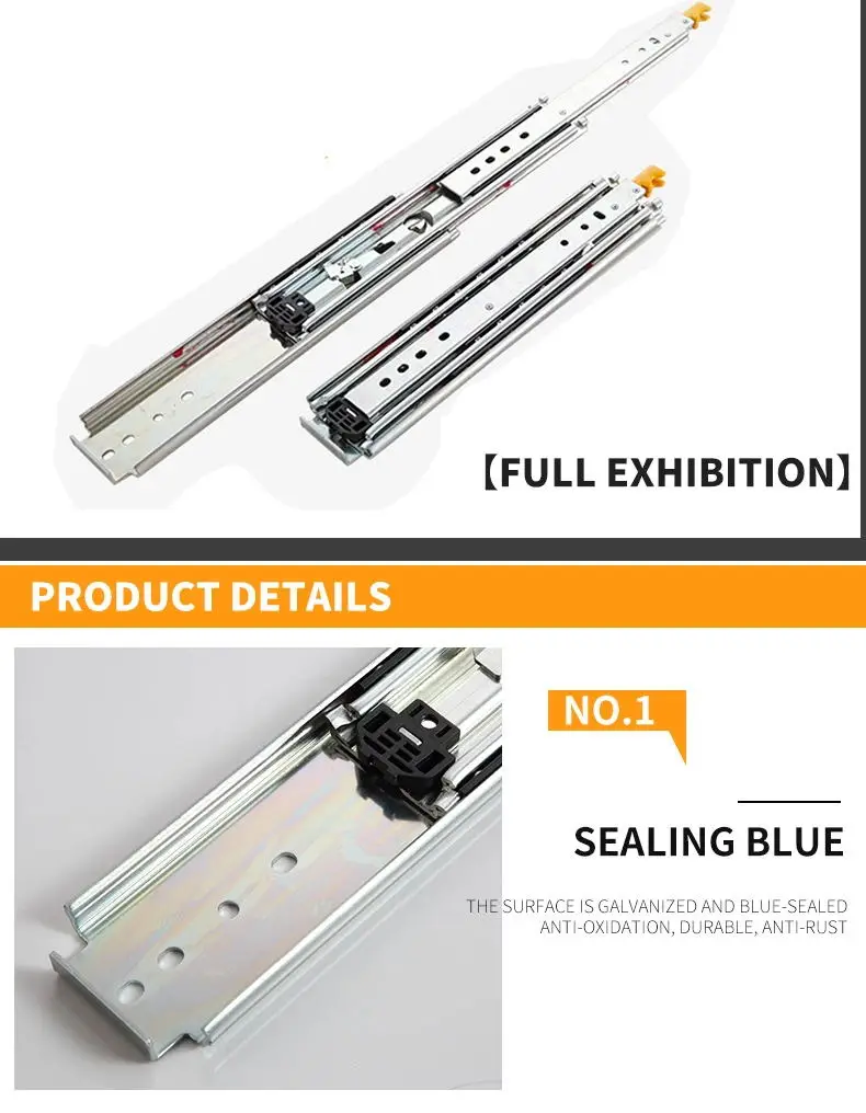 【Brand】 olisun 【Характеристики размера 】 8-60 дюймов с замком (настраиваемый для более чем 60 дюймов) 【Имене】тяжелая направляющая ящика [с замком] 【Обработка поверхности 】герметизация синего цвета (с антикоррозийным и антиокислительным эффектом) 【Ширина 】 76 в ширину [Метод открытия] три полных выставки 【Очистка установки: 19 мм +-0,5 【Максимальная нагрузка: 220 кг 【Material】 холоднокатаная сталь 【Способ установки 】 боковая установка 【Толщина пластины 】внешняя rail-2.5mm средняя rail-2.5mm внутренняя rail-2.5mm 【Объем применения 】 шкаф складские шкафы, медицинское оборудование, промышленные ящики