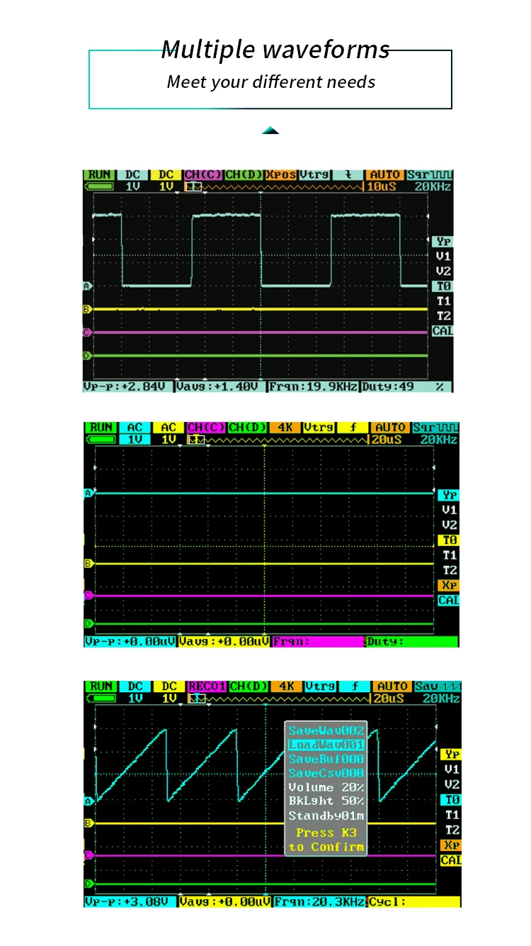 Мощная способность обрабатывать формы волн, она может автоматически измерять такие параметры, как напряжение США, частота и ширина импульса.
