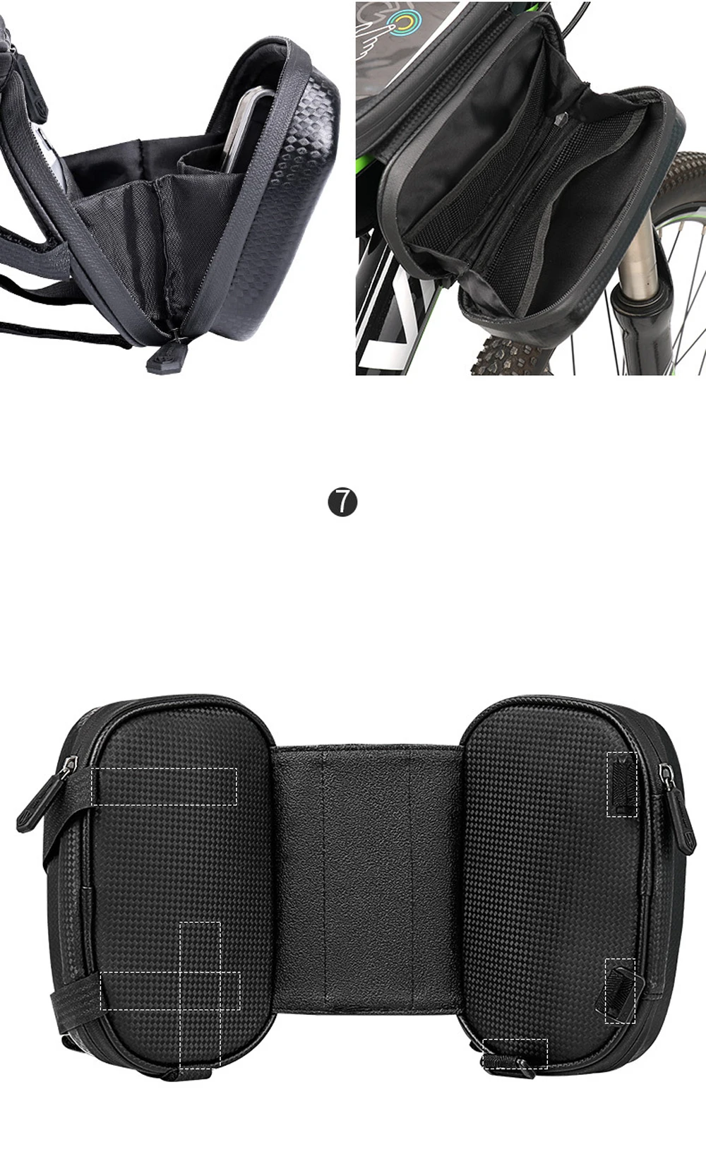 Быстрая установка и безопасность: разработан с тремя ремешками на липучке, этот мешочек может быть надежно прикреплен к раме вашего велосипеда, износостойкие ремни надежно удерживают сумку, а также ваши вещи, никогда не отваливается.