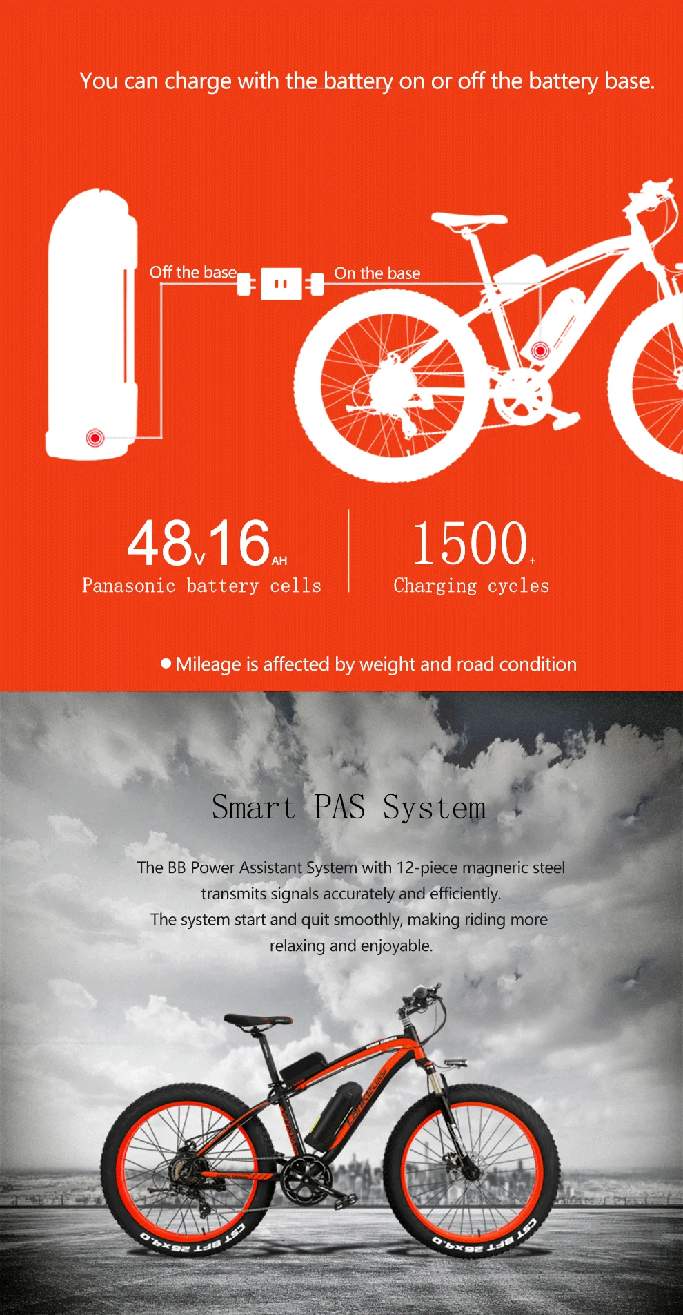 Оснащен 48v 16Ah литиевой батареей, выносливость до 50-70 км полностью электрическим режимом, 100-120 км педальным вспомогательным режимом. Время зарядки: 5-7 часов.